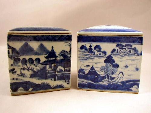 TWO SIMILAR CHINESE EXPORT PORCELAIN SQUARE COVERED TEA CADDIES; Canton, with slightly domed lids, 6- 1/2"h x 5 3/4"w x 5 3/4"d
