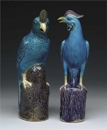 TWO SIMILAR CHINESE PORCELAIN BIRD FIGURES. Each turquoise bird stands on a naturalistic wood style mount. SIZE: 14” h. CONDITION: Very good. 9-26658