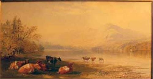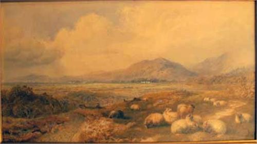 Each depicting bucolic landscapes, one with cows resting and the other with sheep grazing, each bears signature C. (Cornelius) Pearson (British, 1805-1891) and dated 1872, also inscribed "Cattle by T.F. [Thomas Francis] Wainwright", each work also inscribed on verso in pencil indicating location of painting in Great Britain. 8 1/4"h x 16"w.