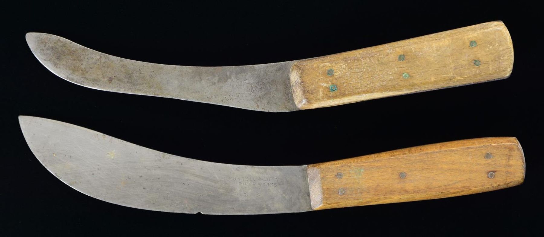 BOTH: Pictured and described on page 195 in "THE FUR TRADE". Author, Milton Von Damm. CONDITION: good to very good. "SKINNING KNIVES. The Rocky Mountain fur trade for beaver was winding down by 1840, the year of the last Rendezvous. American knife manufacturing began to emerge and dominate the demand for trade knives by trappers and traders remaining on the frontier, by the active trapping still being conducted in Canada, by Indians receiving payments for being displaced, and by the continuation of the Indians' harvest of buffalo to trade hides and skins. Lamson and Goodnow dominated the trade knife market between 1844 and 1865 and English knives were also seriously challenged by John Russell & Co. The emergence of the blade shape known as the skinning knife coincided with an increase in buffalo hunting. It has been described as a butcher knife with a sharp upward curve. One skinning knife has a 6" blade and is 10 1/2 inches long. It is marked J. Russell & Co. over a diamond design. The reference to Green River dates the knife to the post mountain man period and only became popular with the publication of George Ruxton's novel, "Life in the Far West". The wooden handle is in two pieces and the blade tang follows the length of the handle". Second knife "was made by Landers, Frary and Clark and is marked UNIVERSAL USA. The blade is 5 1/2" and the knife is 10 inches in length." PROVENANCE: Lifelong Collection of author Milton Von Damm. (02-22239-2/JS). $200-300.