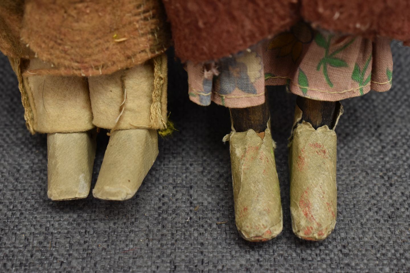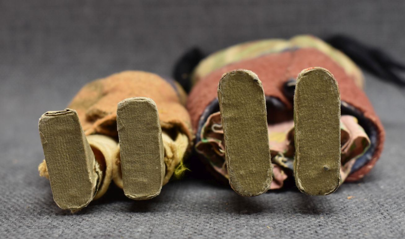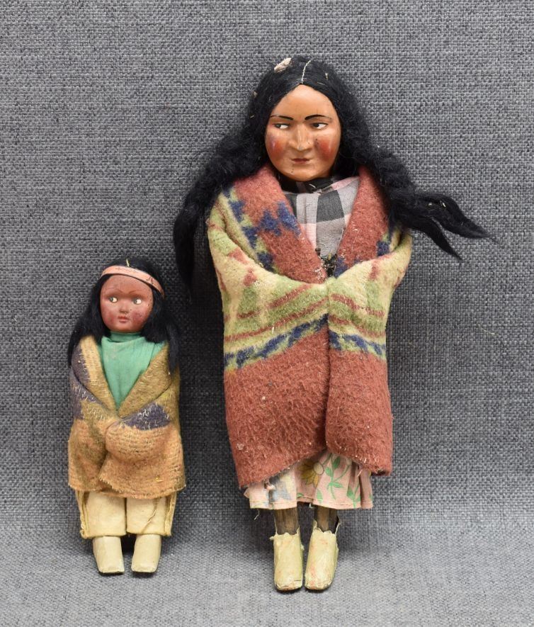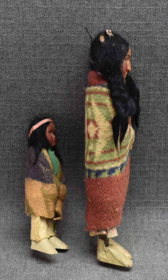 1920-30's skookum dolls with traditional cloth design and painted faces with wood legs wrapped in paper largest 11" tall