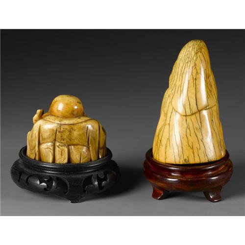 <B>TWO SMALL CHINESE CARVED IVORY FIGURES</B></I><BR>Late Nineteenth/Early Twentieth Century<BR>Ivory<BR>Unmarked<BR>2-1/2in. wide and 4-1/8in. high<BR><BR>Two small Chinese carved ivory figures: stained Buddha; together with a sleeping figure of a man wrapped in his robes and curled up, on wood stands<BR><BR> <B>Condition Report:</B> Normal signs of wear as appropriate with age.<BR><BR><b>Shipping:</b> Hollowware/Pottery/Glass, Small (<a target="_blank" href="http://www.heritageauctions.com/common/shipping.php">view shipping information</a>)