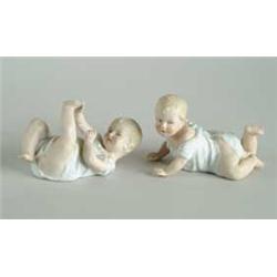 Lot 1460 TWO SMALL PIANO BABIES. Both have impressed mark by “Gebruder Heubach”. One in crawling position with head up, other is on back with one hand touching foot. Hand has chipped fingertips. SIZE: 5”. CONDITION: As noted, otherwise good. 9-96615 (200-300)