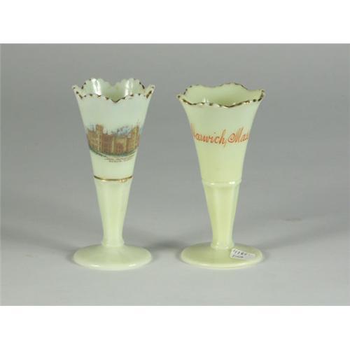 Two souvenir custard glass bud vases to include one with a decal decoration and inscription of ''The State Normal School, Dekalb, Illinois'', 6.25'', and the other with the painted inscription, ''Harwich, Mass.'', 6''. Some wear to gilding noted to both, no chips or cracks noted.