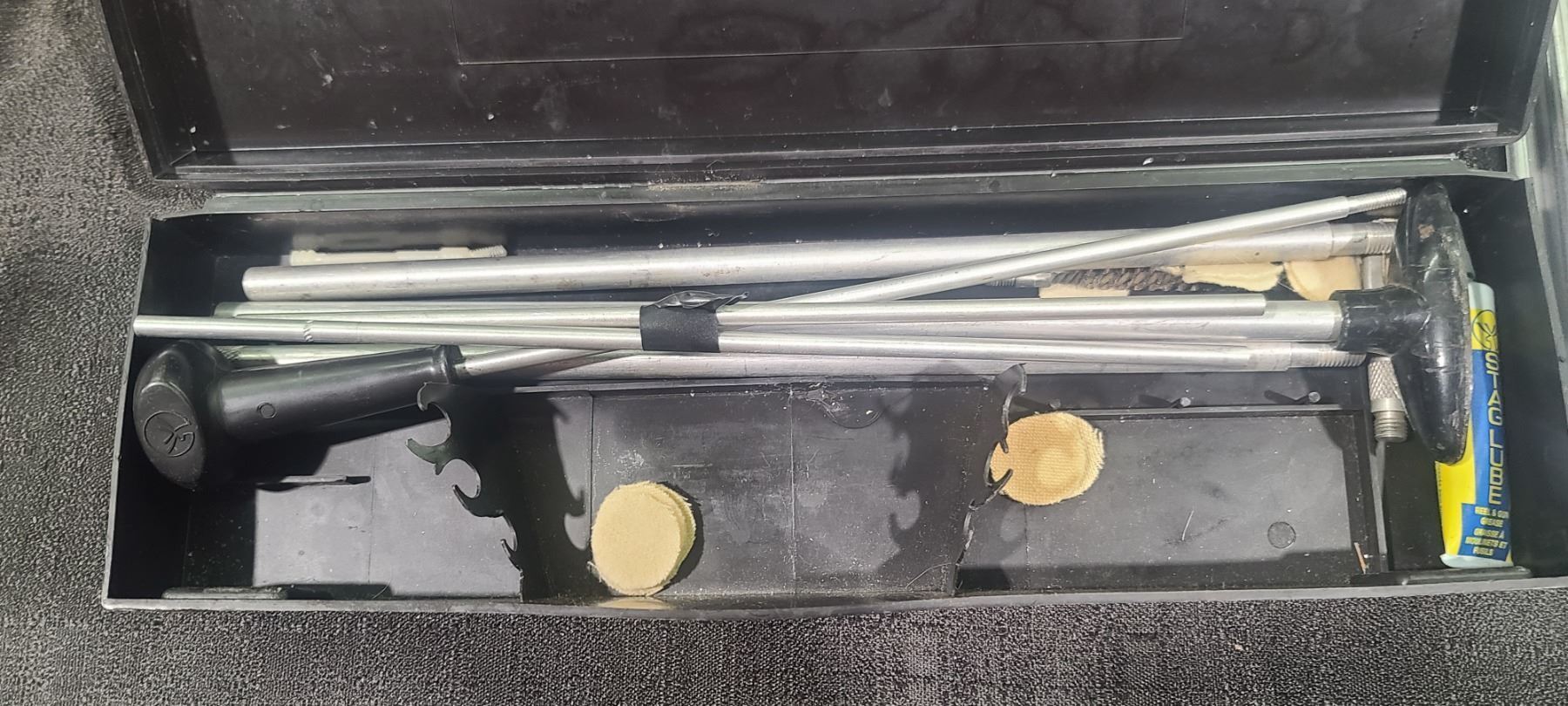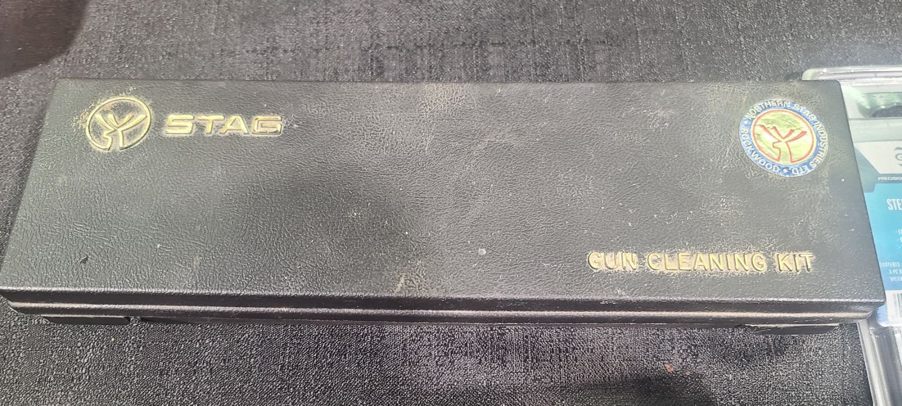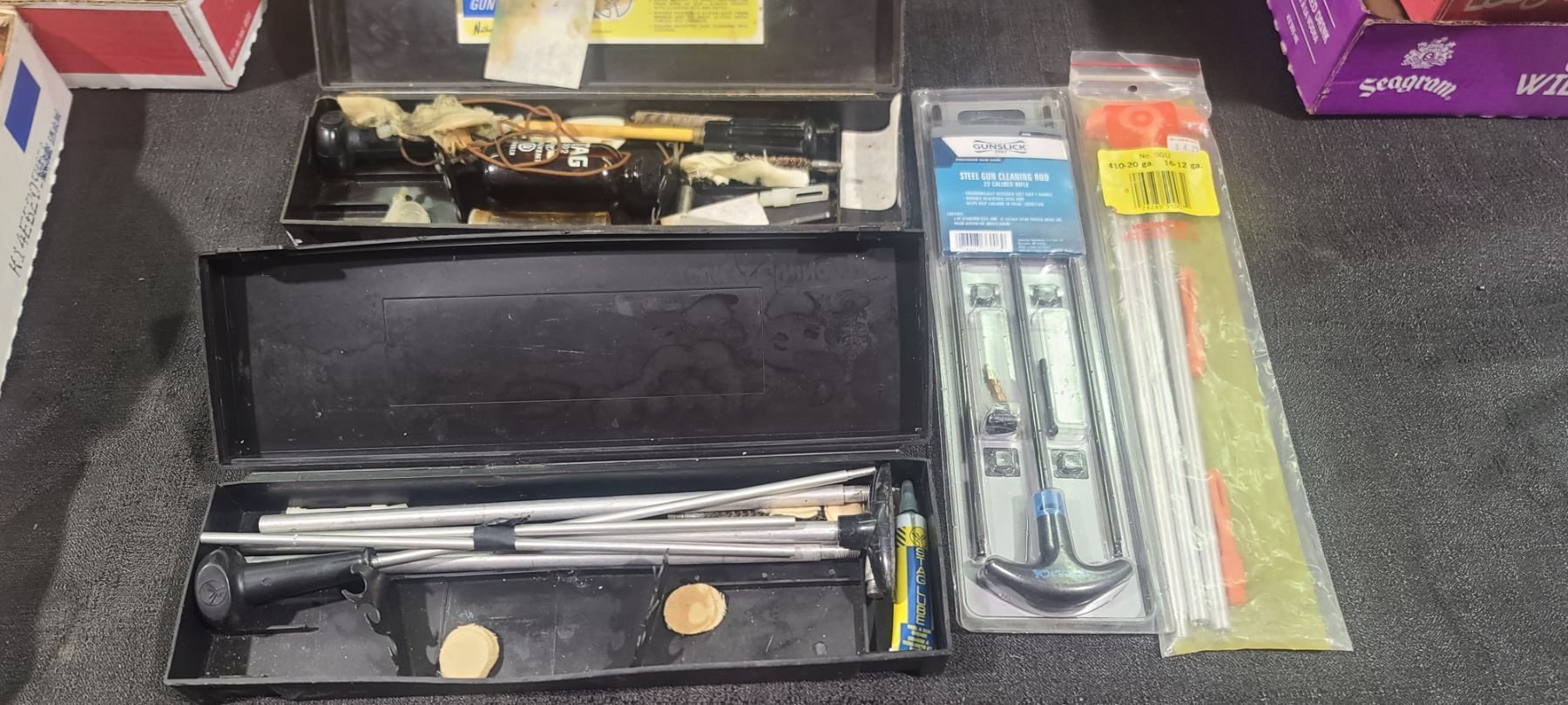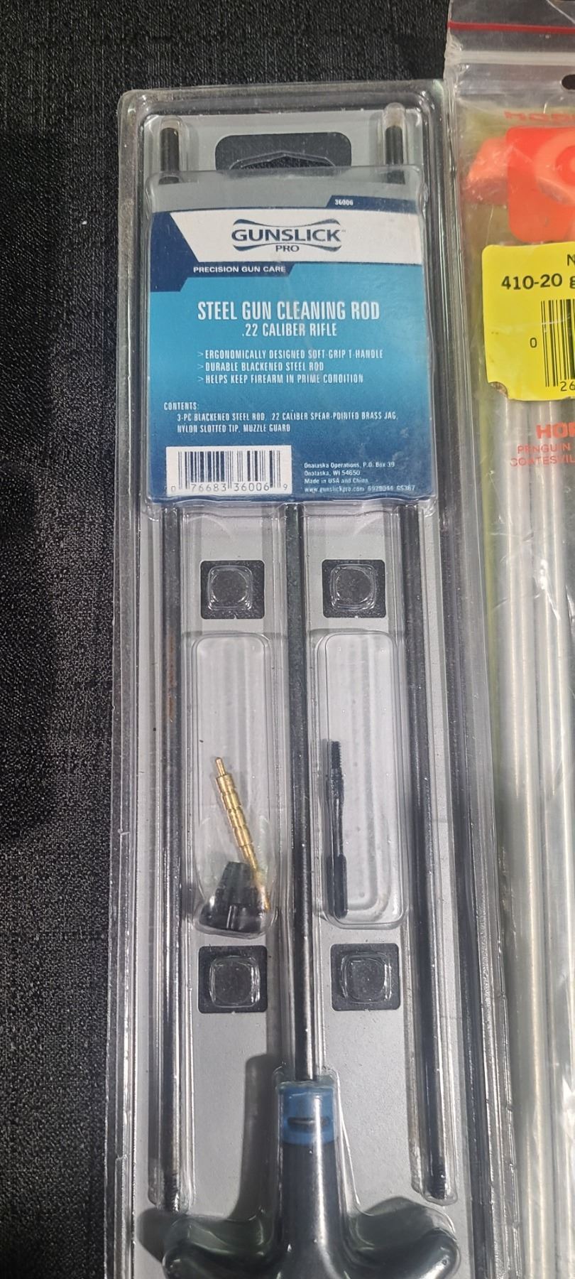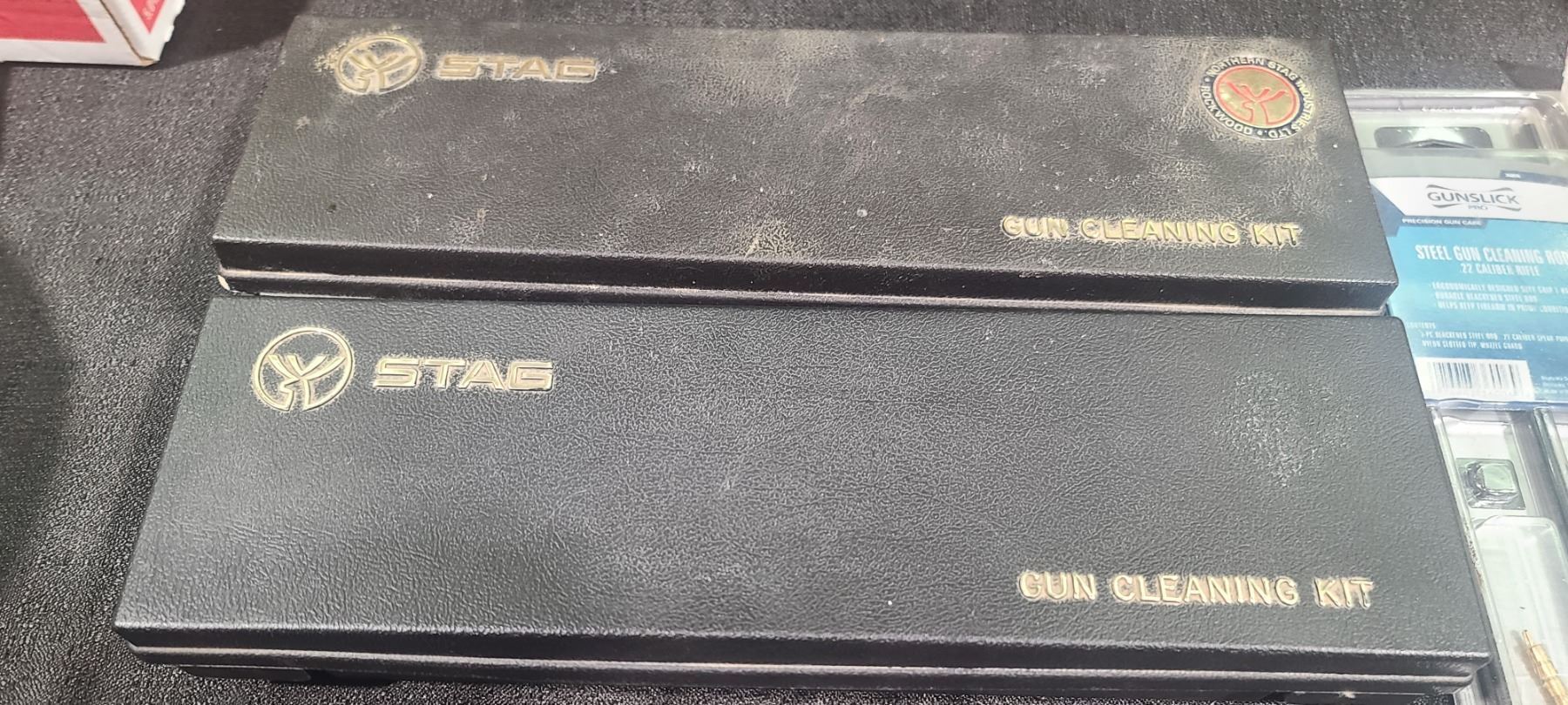 TWO STAG GUN CLEANING KITS, ONE GUNSLICK .22CAL CLEANING ROD, AND HOPPES .410 TO 20GA AND 16GA TO 12GA CLLEANING RODS