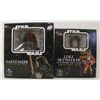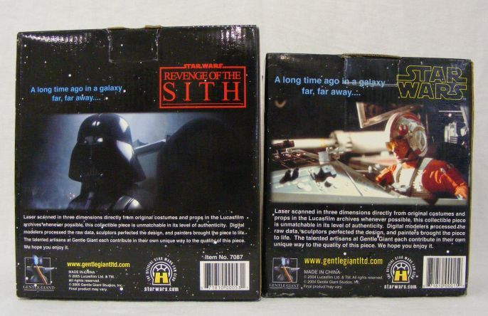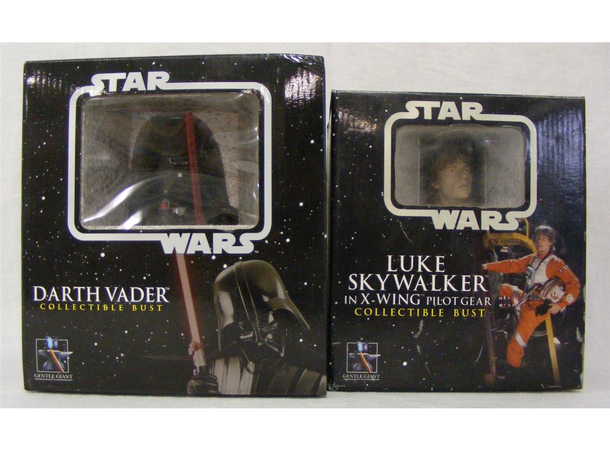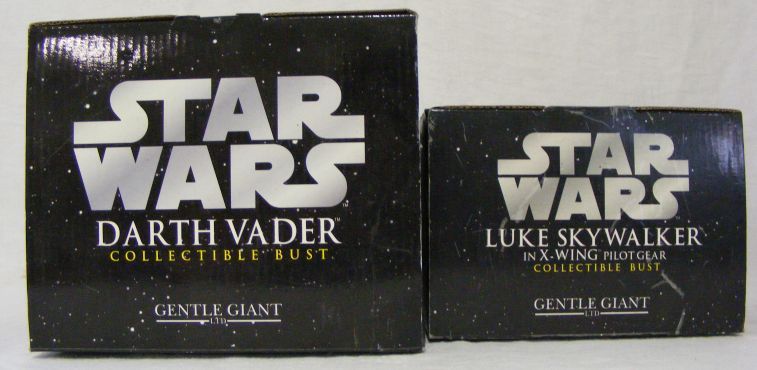 2004-2005 by Gentle Giant ltd, Luke Skywalker with damaged helmet 8"x7"x5", Darth Vader with damaged lightsaber 8"x7"x8", both in boxes, boxes are damaged