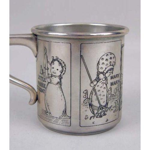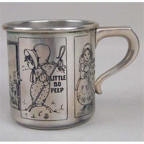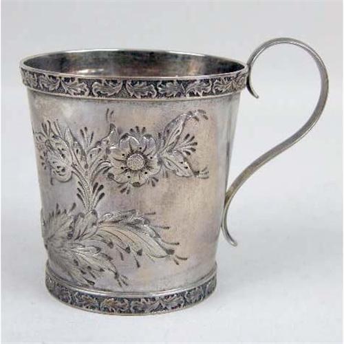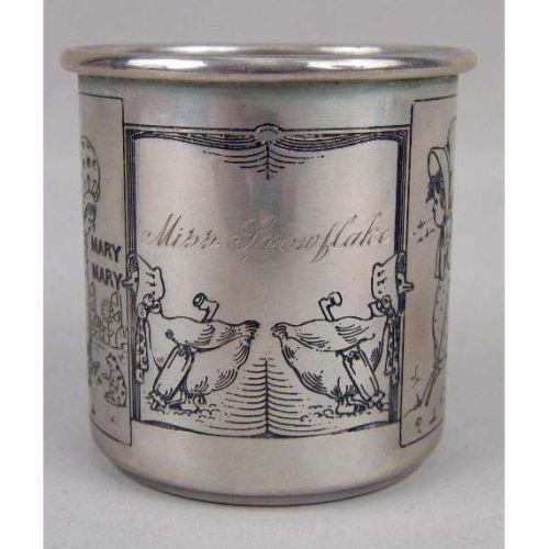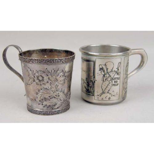 TWO STERLING SILVER CHILDREN`S CUPS<BR><BR>One engraved with nursery rhyme figures, the other with a repousse floral motif, each 2-1/2`high, total weight apx. 5 T.O.