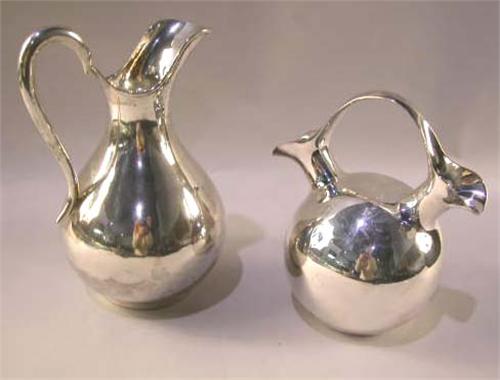TWO STERLING SILVER PITCHERS; One marked 900 and the other 925 Together with a silver plated vodka server with fish finials