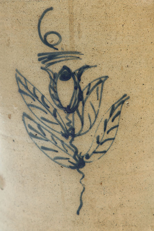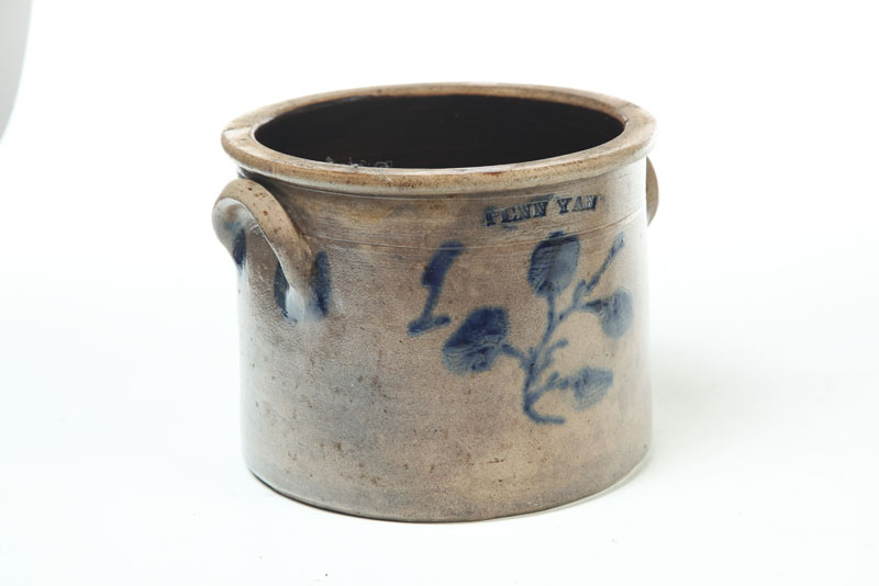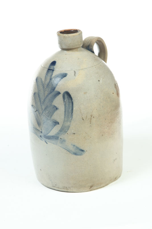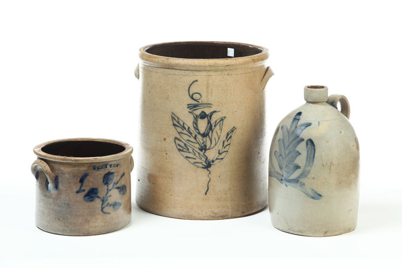 American, mid 19th century. Jug with applied handle and stylized cobalt foliage, 12 1/2"h., and a crock with handles and brushed cobalt "6" and tulip, 14"h. Together with a small crock impressed "Penn Yan" with handles and cobalt flowers, 6 1/2"h.