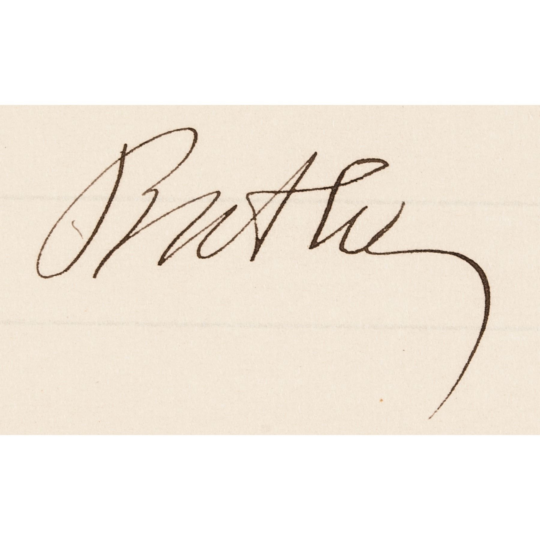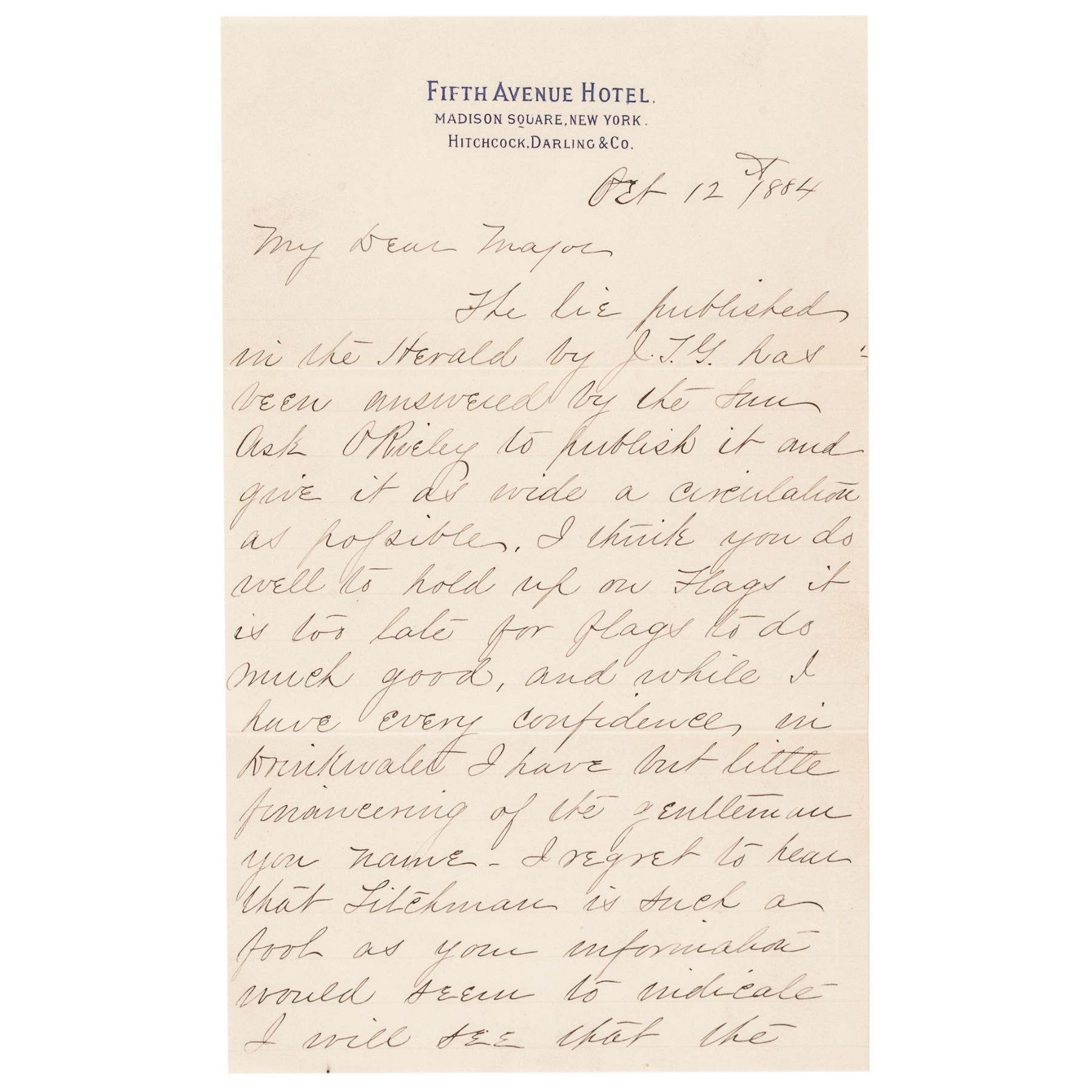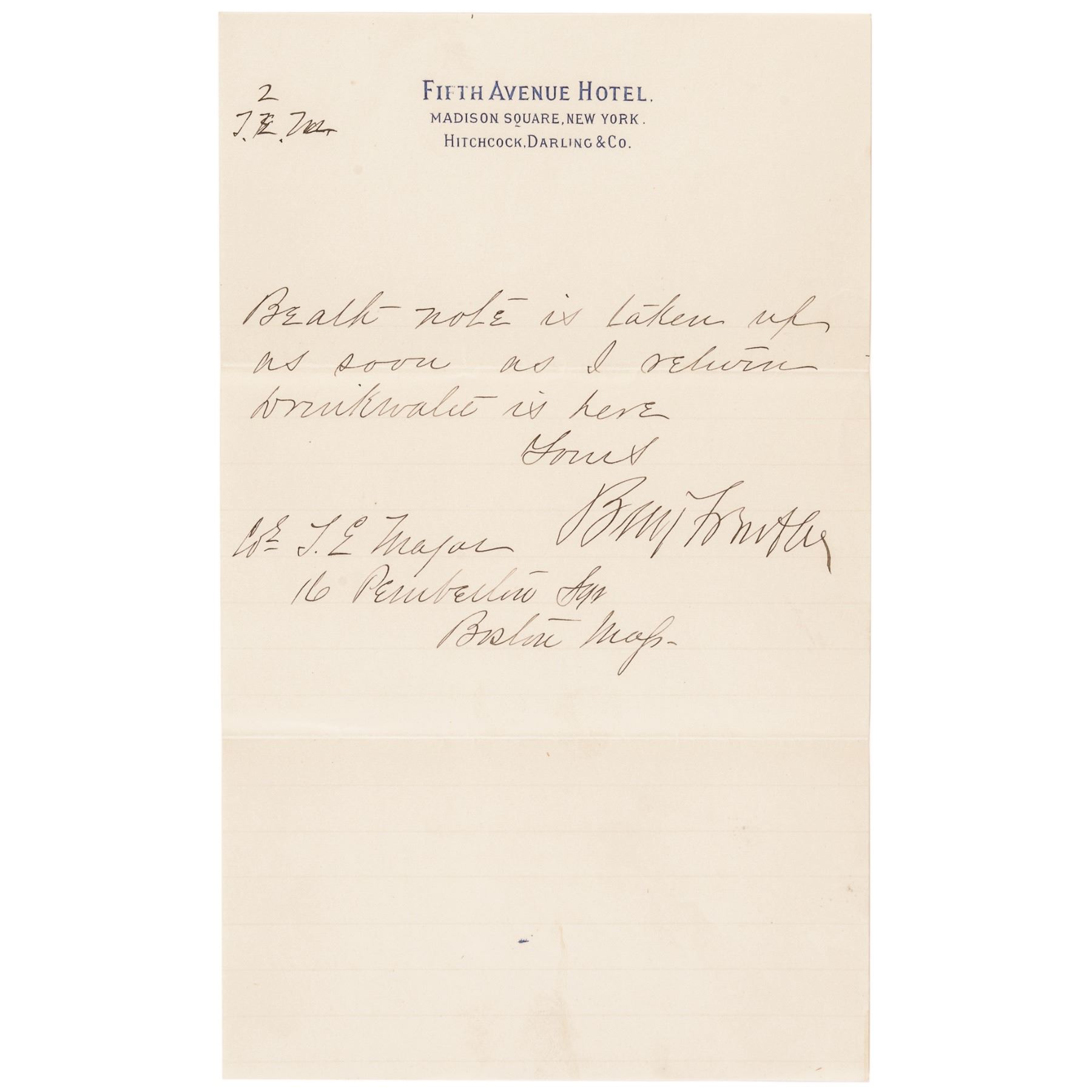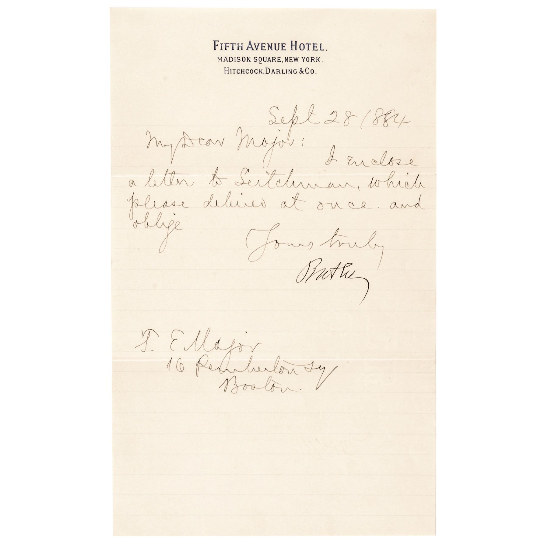 1. October 12, 1884-Dated Manuscript Letter Signed, “Butler,” as Presidential nominee of the Greenback and Anti-Monopoly parties, 1 pages, octavo, 5.5” x 9”, Choice Extremely Fine. Great content in this letter written from Butler to Col. T.E. Major, his private secretary. Reads, in part: “... The lie published in the Herald... has been answered by the Sun. Ask O’Reilly to publish it and give it as wide a circulation as possible. I think you do well to hold up on Flags it is too late for flags to do much good... I have but little financing of the gentleman you name...” On Fifth Avenue Hotel, Madison Square, New York. Hitchcock, Darling & Co. letterhead. Expected folds, else very fine condition.