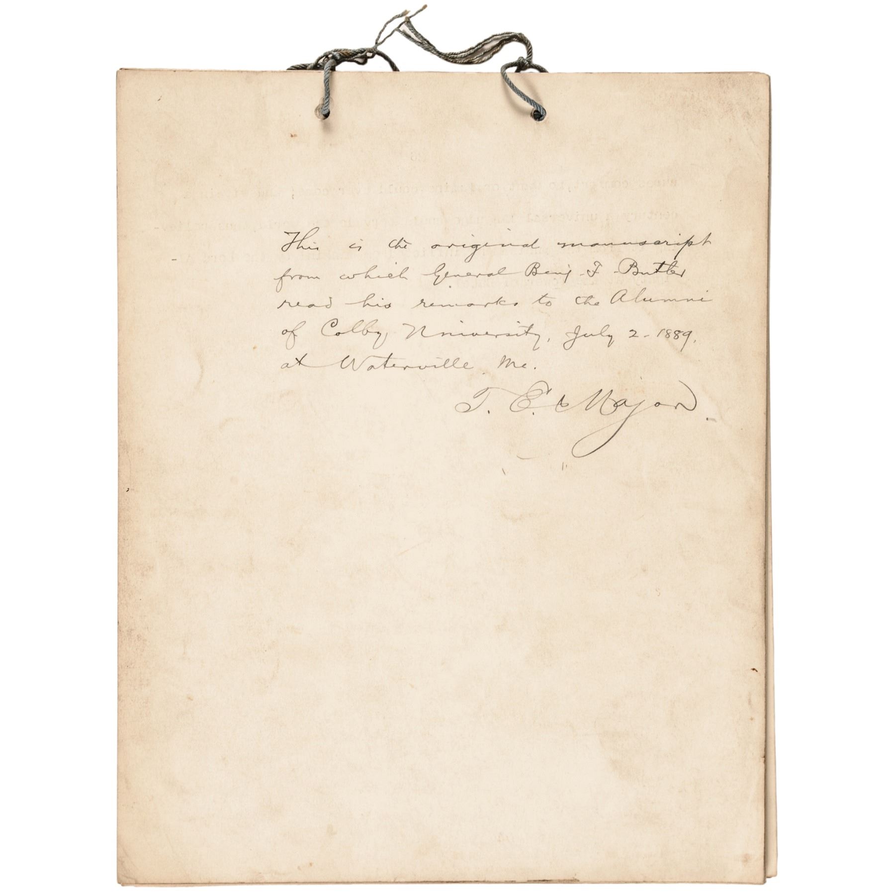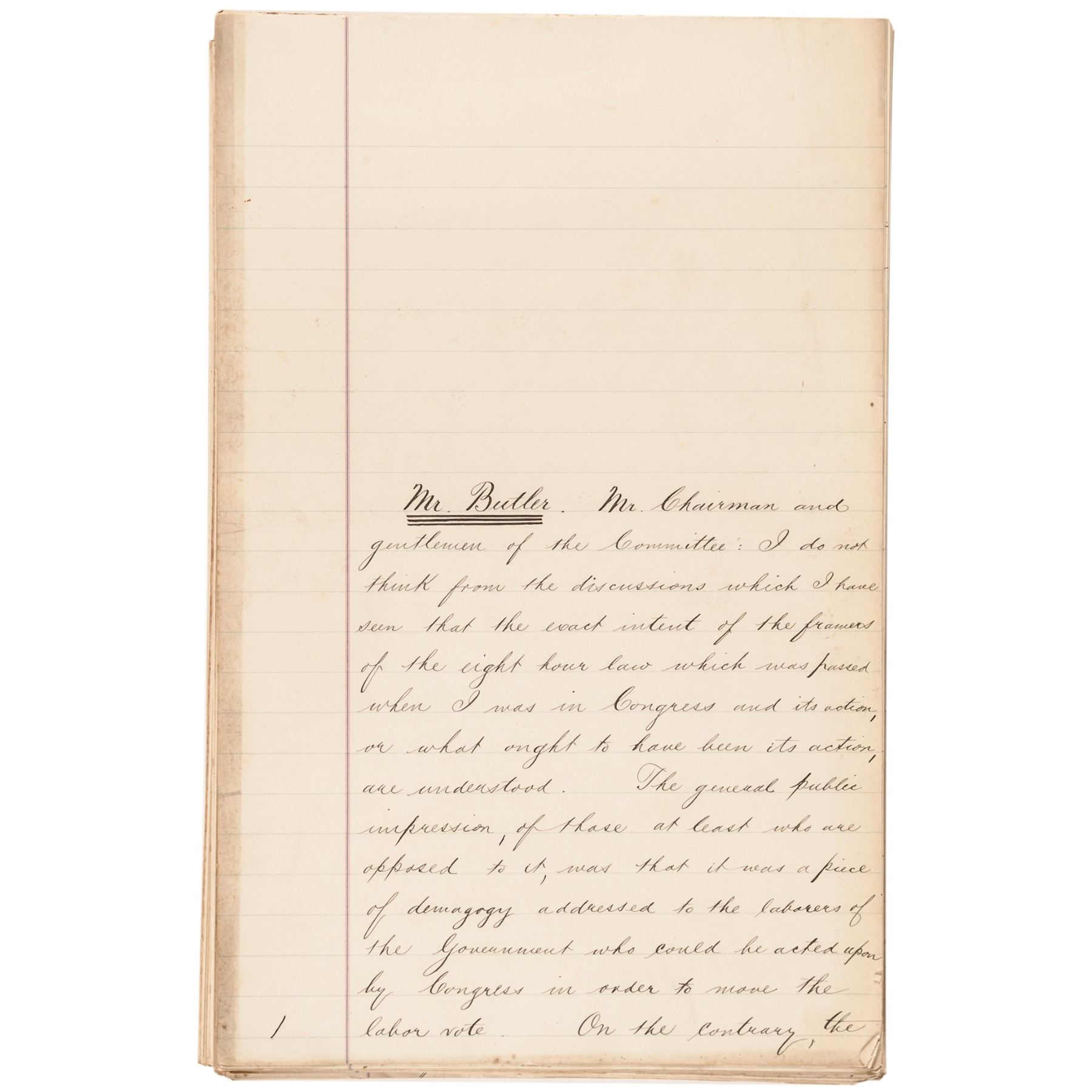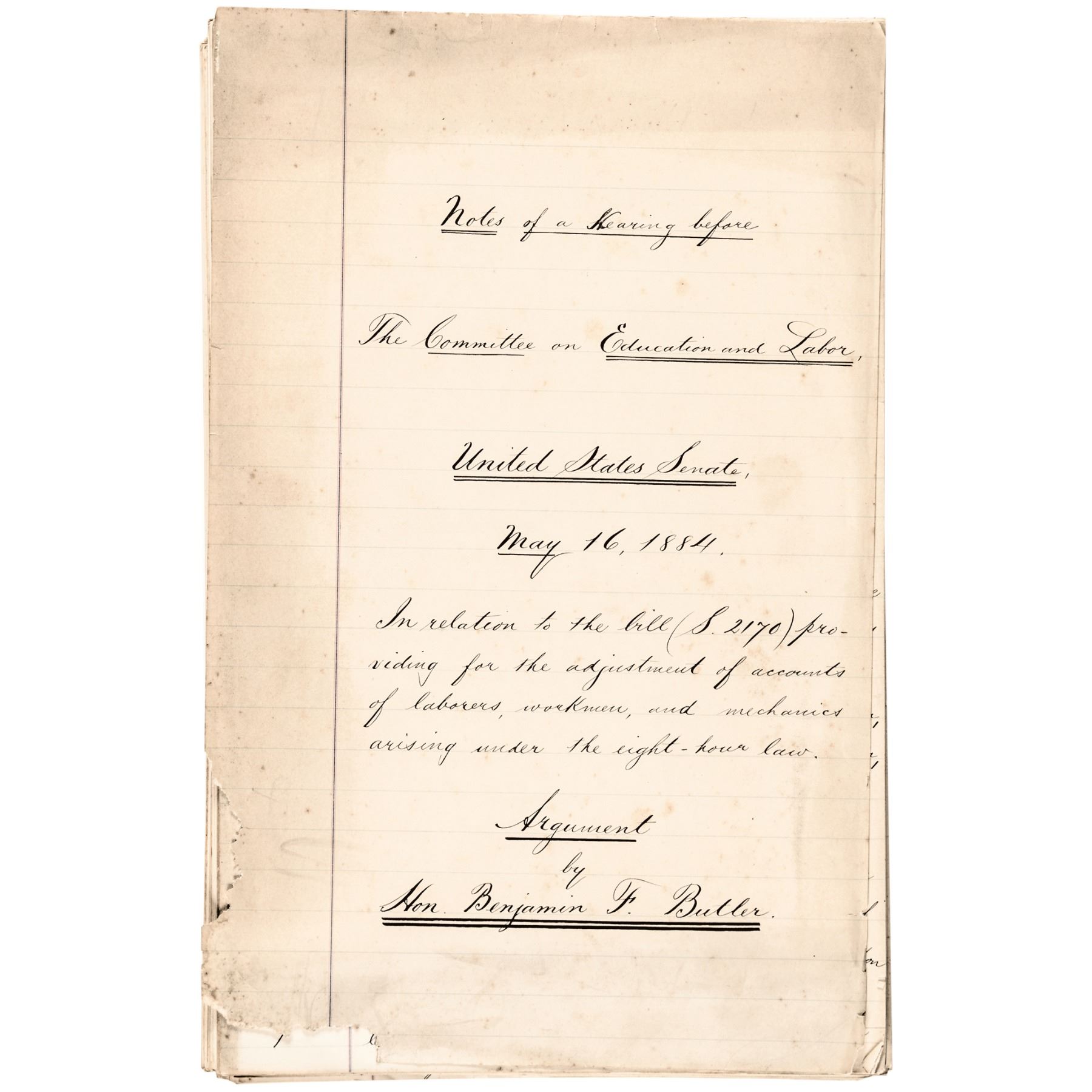 4. May 16, 1884-Dated, not signed, Manuscript Transcript of statements and comments: “Notes of a Hearing before the Committee on Education and Labor, United States Senate Mary 16, 1884... Argument by Mr. Benjamin F. Butler,” 108 pages, legal folio, Fine. Light toning throughout, heavier on cover page. Cover page also shows paper loss in lower left corner, overall in nice condition.