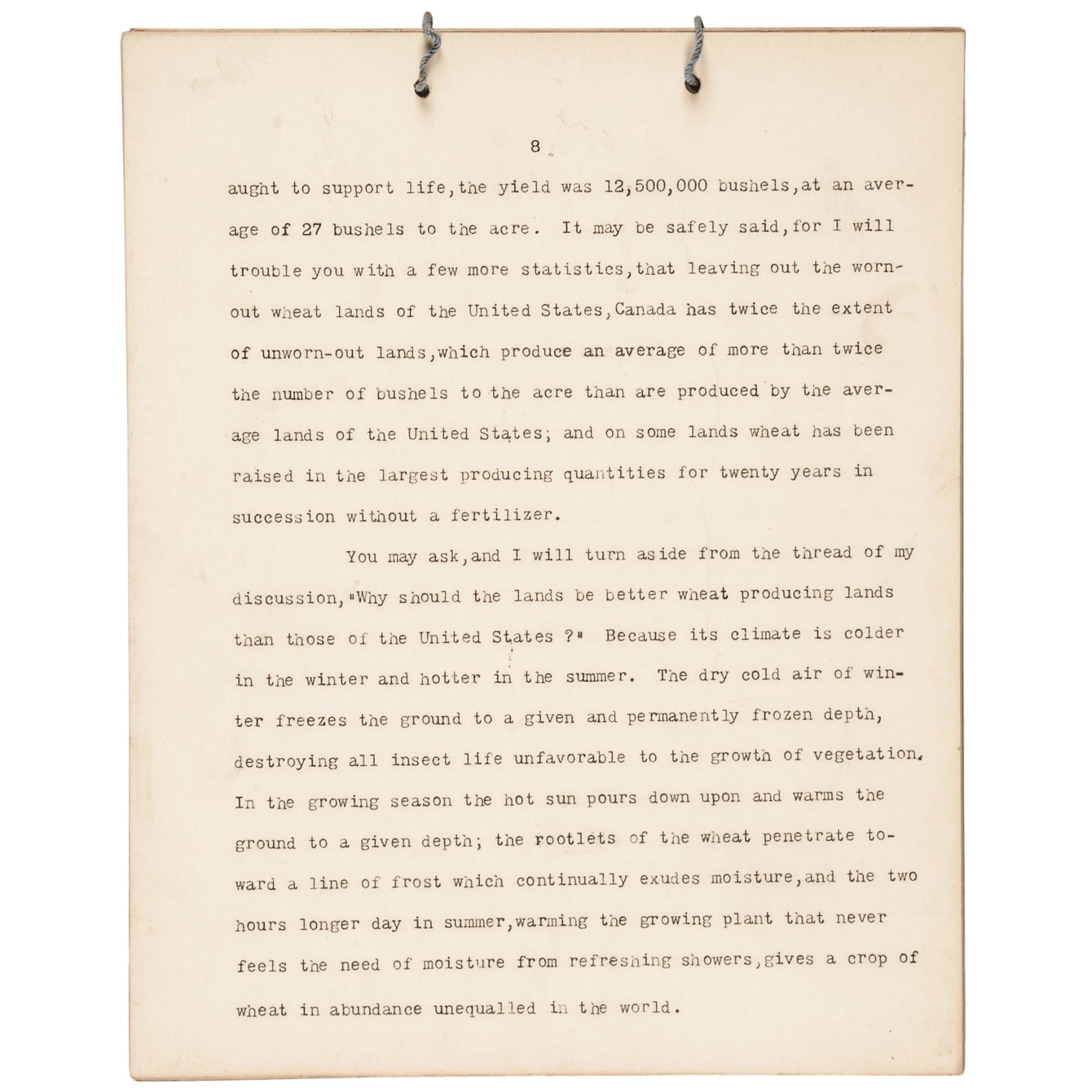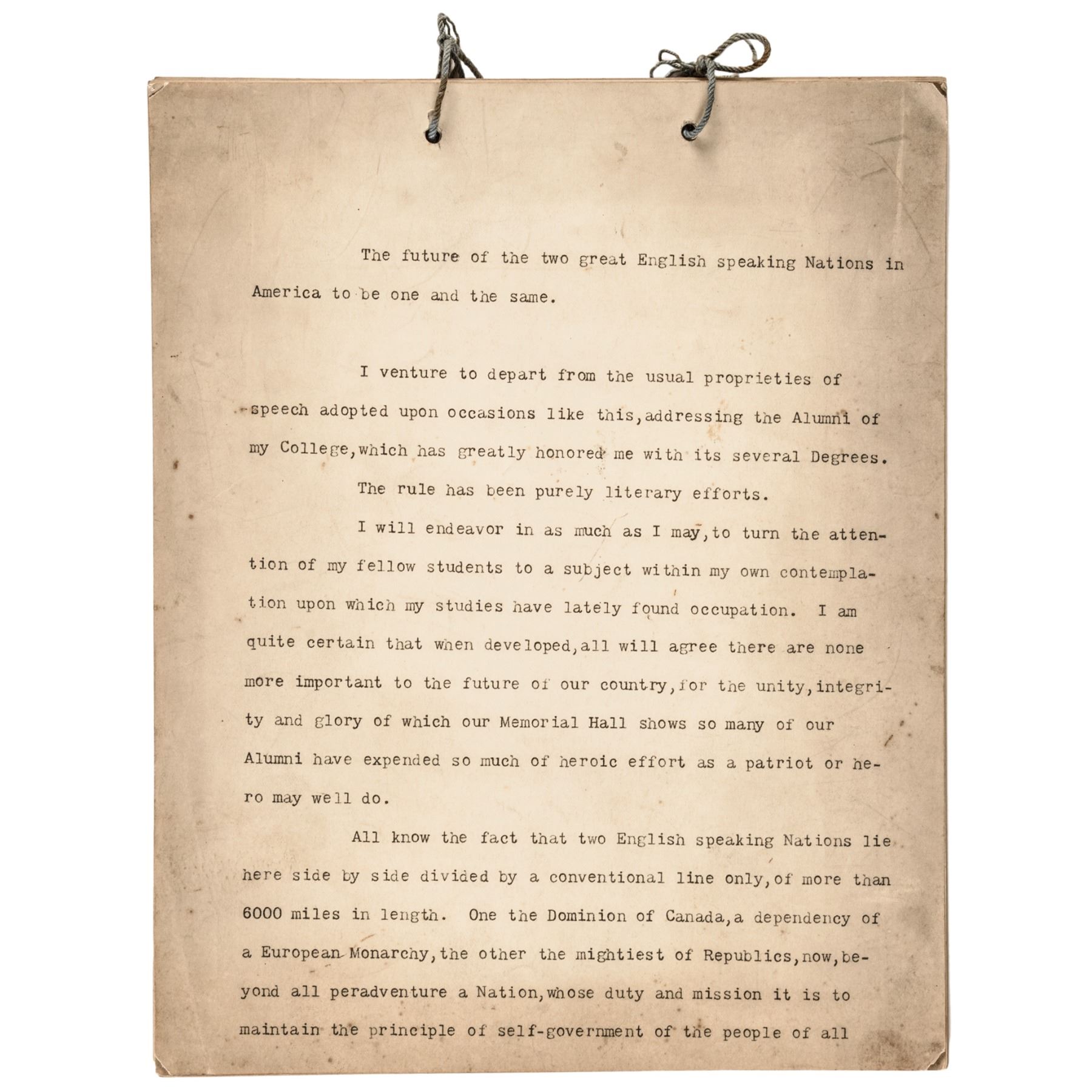 3. Undated, not signed, Typed Reading Copy of a speech given by Butler before his alma mater, Colby College in Maine, 26 pages, quarto, Very Fine. Discusses Canada and the possibility of its merger with the United States. Light toningt throughtout, heavy on the cover page and around the margins. Pages two-hole punched at top and bound together with string.