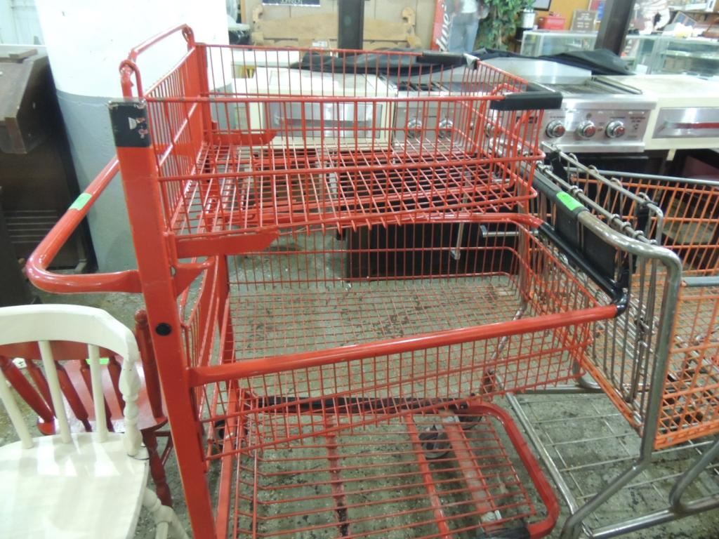 NEW SHOPPING CHAIR, LARGE SHOPPING CART, RED METAL SHOPPING CART, STORE SHOPPING CART AS SHOWN SEE PHOTO FOR MORE DETAILS.