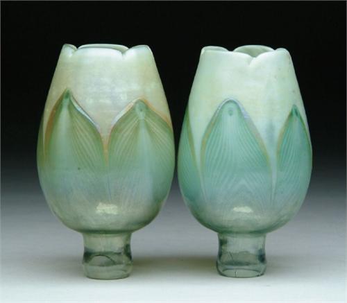 TWO TIFFANY ART GLASS SHADES. Iridescent green and white pulled feather decoration on a bulbous shaped shades. Signed "L.C.T.". SIZE: 5 in. t. CONDITION: Large chip out of one fitter, the other has a crack on the fitter, otherwise very good. 5-60726