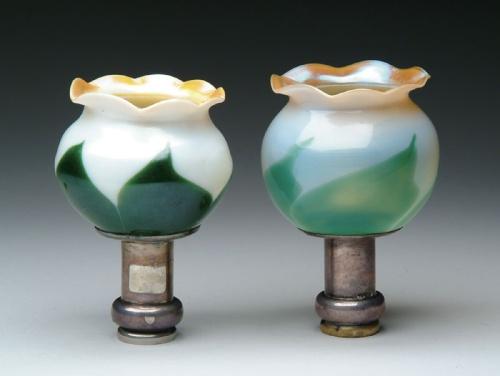 TWO TIFFANY CANDLE SHADES. Wonderful Tiffany shades have green pulled feather design against a white background. Interior of ruffled rim is gold iridescent. Each shade is permanently attached to a white metal candle adapter. Each shade is signed near adapter rim "LCT" with one numbered "S1162" and the other "S116". SIZE: Shade only is 2-1/2 in. t. 4-3/4 in. t including adapter. CONDITION: Very good to excellent. 5-61308