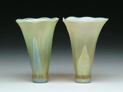 TWO TIFFANY LILY SHADES. Opalescent shades with iridescent gold decoration. Signed "L.C.T." on fitter. SIZE: 4-1/4 in. t. CONDITION: One shade has a minor flake to fitter rim, otherwise very good to excellent. Estate of Jon Heiden and Donald Mooers 5-60664-1234
