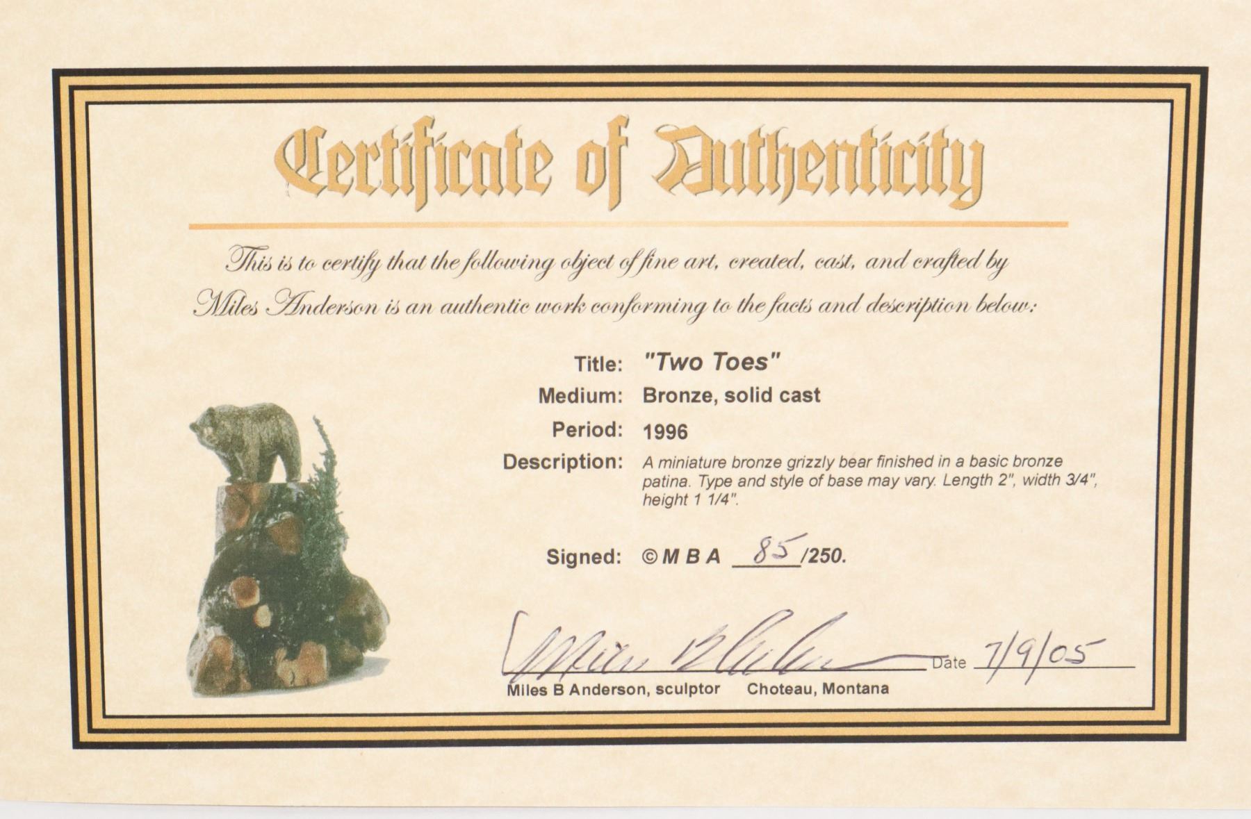 B ANDERSON. LIMITED EDITION 85/ 250 WITH CERTIFICATE OF AUTHENTICITY. LENGTH 2", WIDTH 3/4", HEIGHT 1-1/4"***ITEM(S) LOCATED IN LETHBRIDGE ALBERTA. ALL ITEMS IN THIS AUCTION QUALIFY FOR OUR FREE TRANSPORT TO EDMONTON SERVICE. WORLDWIDE SHIPPING AVAILABLE