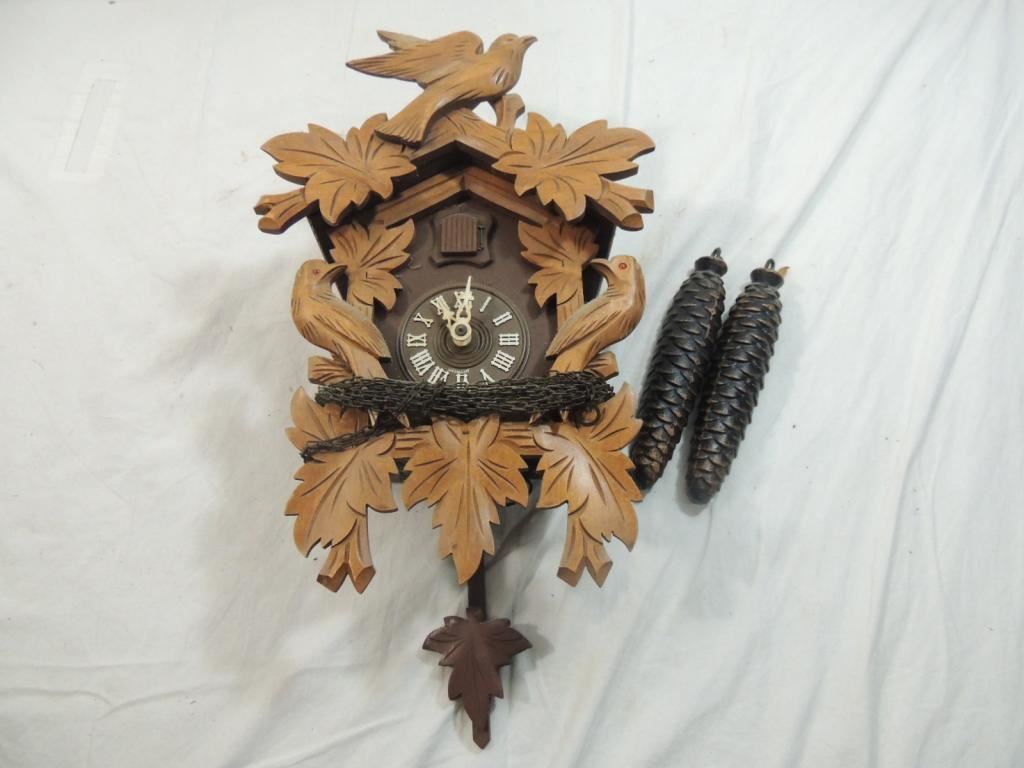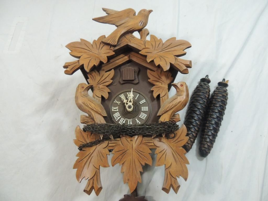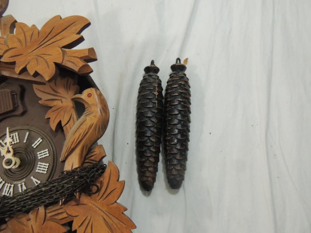 BIRDS & LEAVES ANTIQUE GERMAN MADE BLACK FOREST CLOCK COO COO CLOCK, COCKOO CLOCK, WOODEN CLOCK, ACORN WEIGHTS, WORKING COCKOO CLOCK, COLLECTORS CLOCK, COLLECTIBLE CLOCK, HIGHLY DETAILED CLOCK, AS SHOWN SEE PHOTO FOR MORE DETAILS.