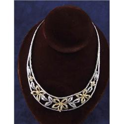 Lot 106 TWO-TONED GOLD AND DIAMOND NECKLACE Necklace is made up of box links each set with 6 single-cut diamonds and widens at the front to embrace stylized yellow gold flowers and white gold leaves all encrusted with diamonds. Total diamond weight is 7.74ct. CONDITION: Very good to excellent. 5-70905