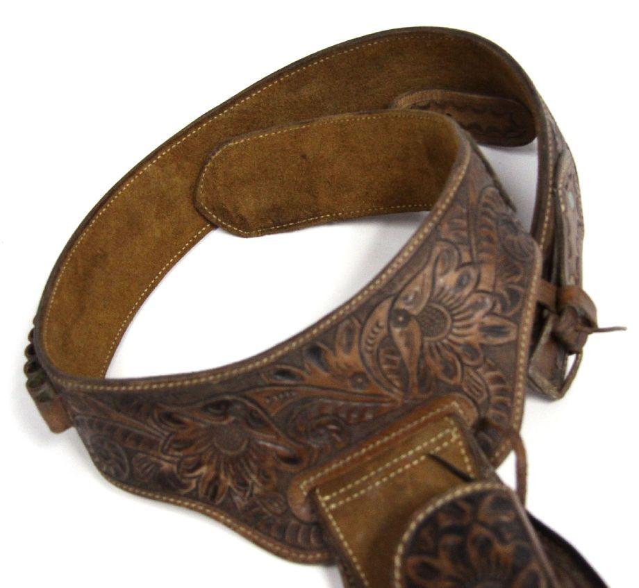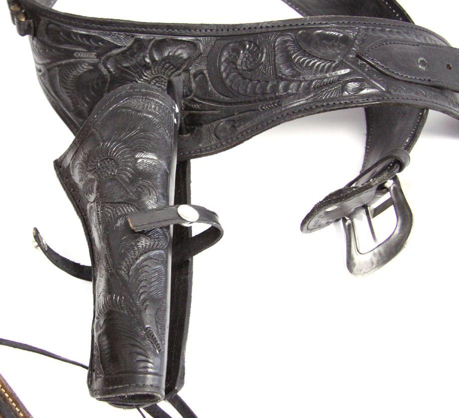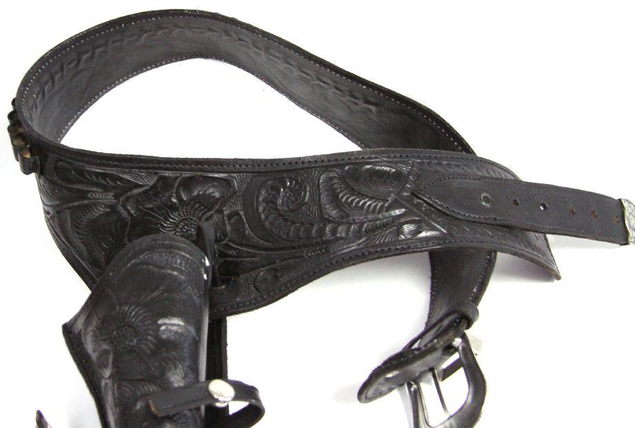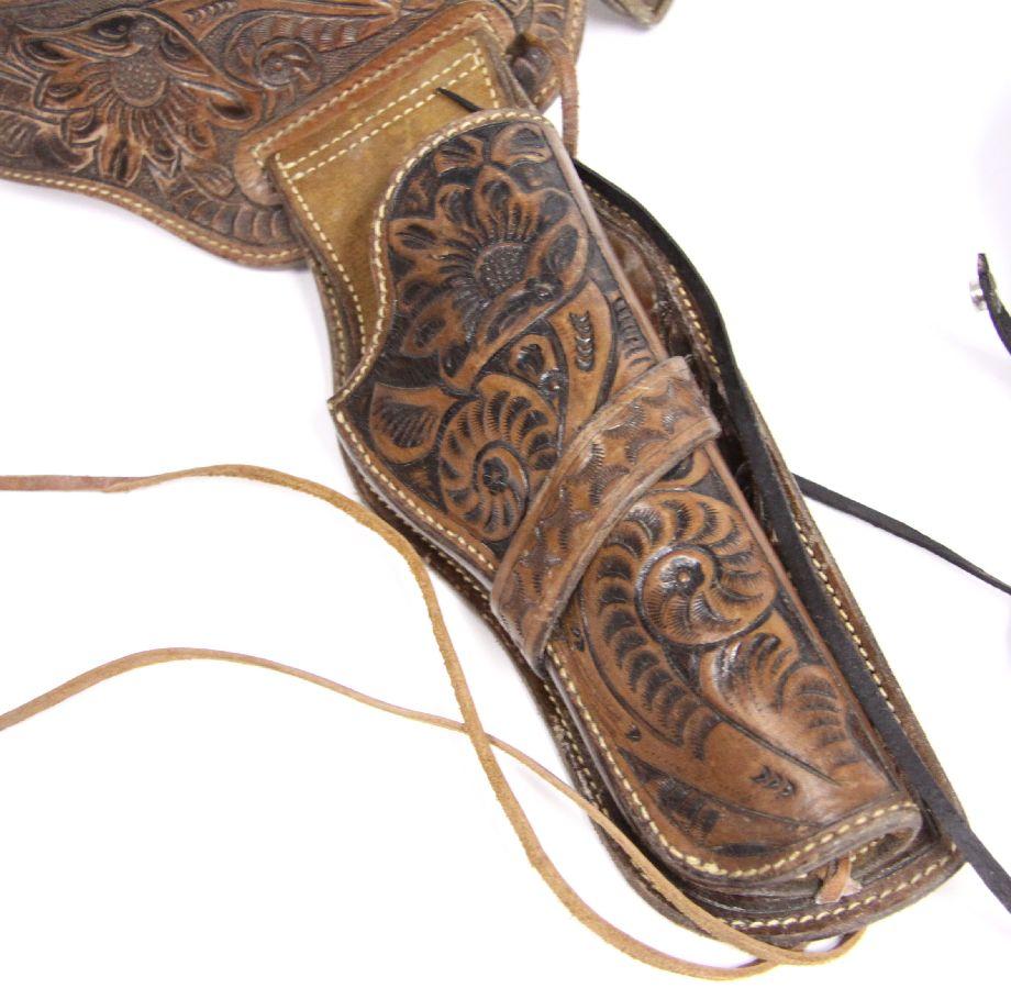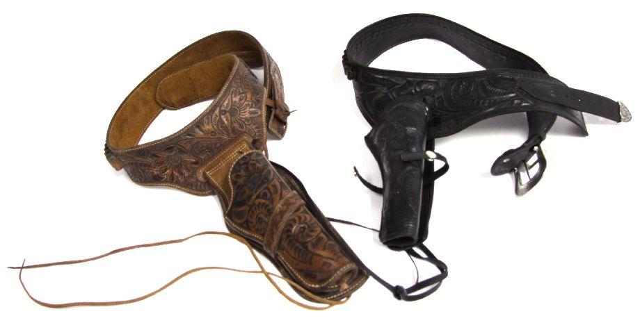 Two Western style tooled leather pistol belts, sizes 36 and 38. Ammunition loops along backs of both. Both in very good condition, and of quality construction.