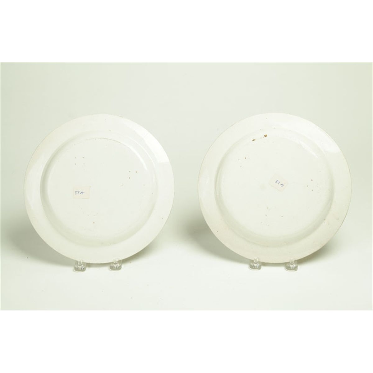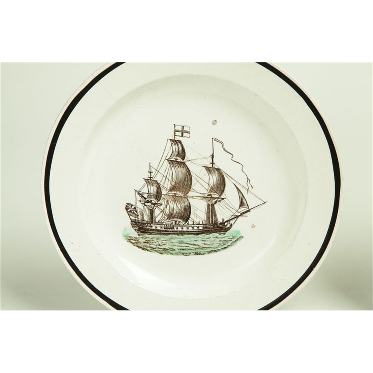 England, late 18th century, creamware. Possibly Wedgwood or Shorthose and Heath. Identical ships with green enamel, one with bird border, one with stripe (hairlines).