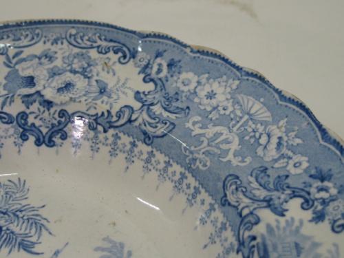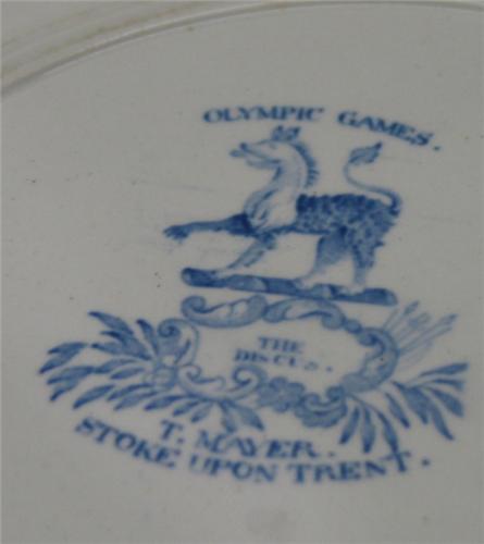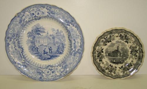 LOT OF TWO TRANSFERWARE PLATES. Consists of one Thomas Mayer (1826-1835) blue transferware cream soup bowl titled "The Discus" in the "Olympic Games" set. Has one small chip along outer rim. Marked on reverse. 10" Dia. Also consists of one small black transferware bread plate. Plate is marked illegibly on reverse. 7" Dia.