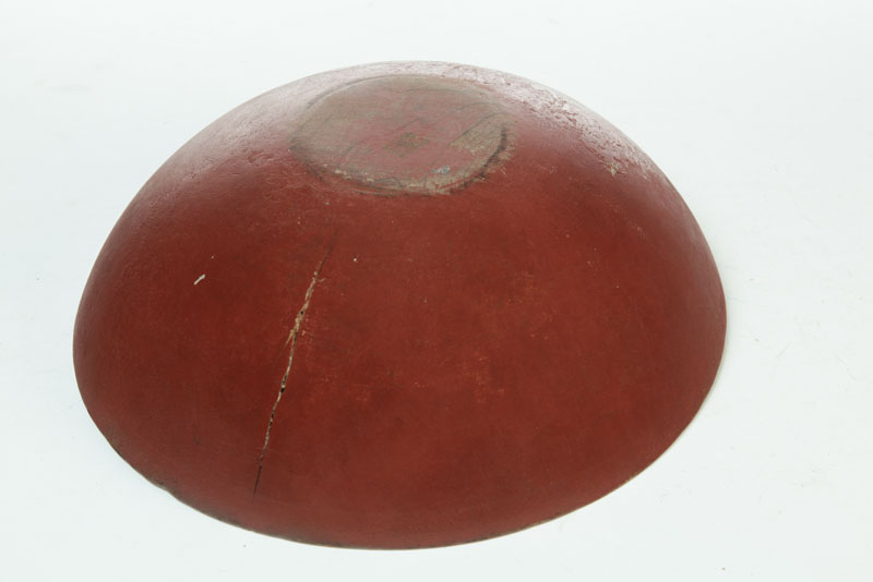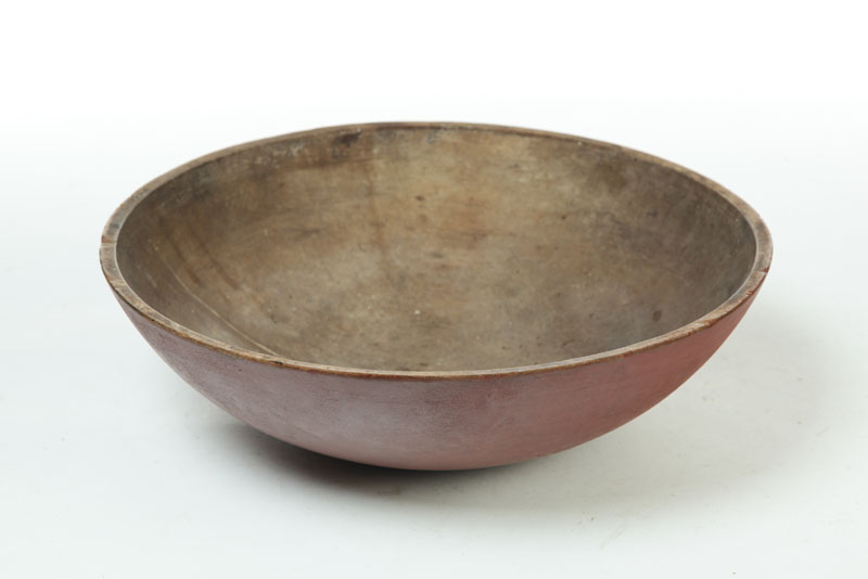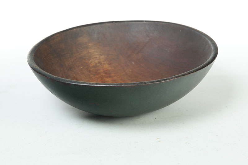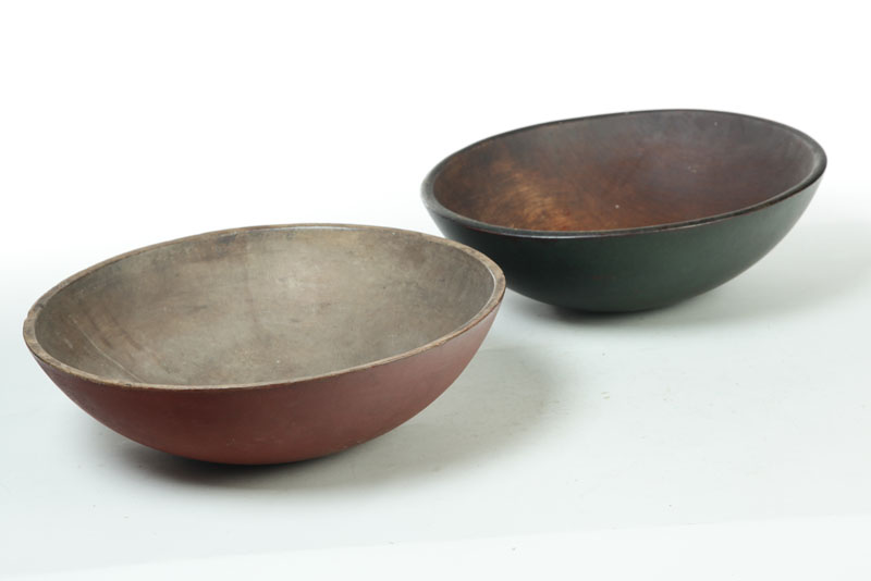 New England, 2nd half-19th century. Maple from Massachusetts with enhanced red exterior. Age split. 5"h. 15"w. And birch from New Hampshire with original green exterior and dark patina inside. 5"h. 15"d.
