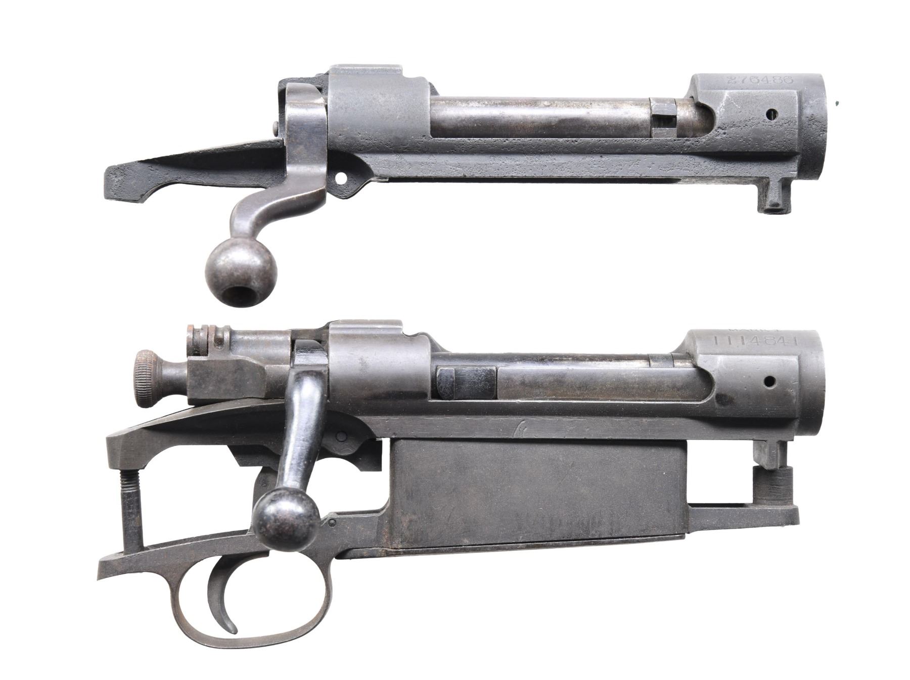 ONE STANDARD 1903 PARTIAL. NO. 1: Model 1903. S# 276486. Stripped receiver mfg. in 1907. Receiver has been modified to accept a stripped Model 1917 bolt. CONDITION: receiver & bolt well-worn turned overall gray & patina w/ oxidation as well as fine pitting. (24-7254/RW). NO. 2: Springfield MKI Action. S# 1114841. Receiver has Remington model A3O3 replacement bolt assembly fitting standard model 1903 cutoff & trigger. Milled trigger guard & follower. CONDITION: action has a worn dark arsenal rework Parkerization w/ scattered spots of light oxidation. (24-7255/RW). BOTH MODERN. $100-200.
