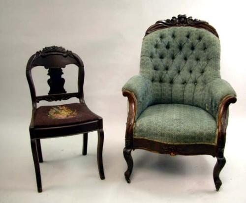 TWO VICTORIAN CARVED CHAIRS; Comprising a Rococo Revival carved mahogany armchair with a volute carved crest above a tufted back flanked by carved arms and ending on cabriole legs. The second is an empire style carved side chair with a carved crest above a vasiform splat, the serpentine front seat rail centering a slip seat. (Each with losses, breaks, and repairs) 33"h to 42"h