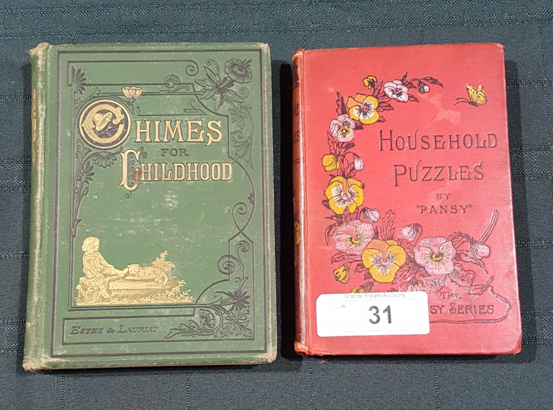 "CHIMES FOR CHILDHOOD" DATED 1879, ILLUSTRATED, SHOWS WEAR & "HOUSEHOLD PUZZLES" PANSY SERIES NOVEL