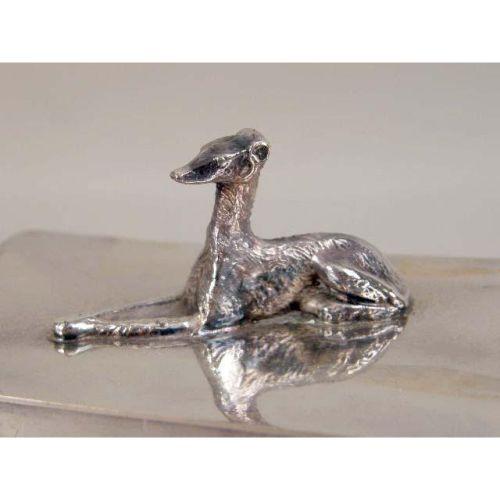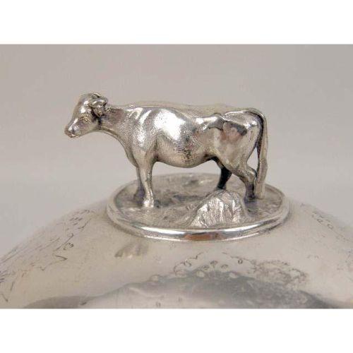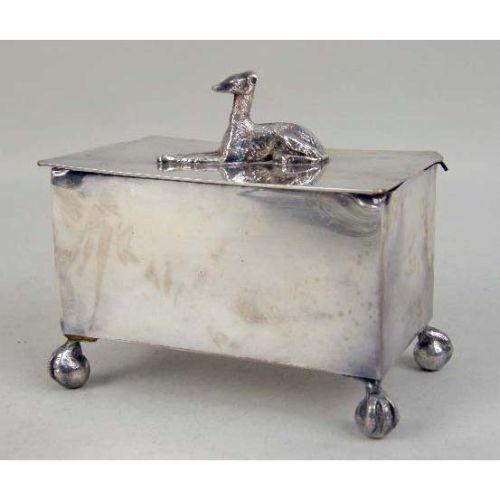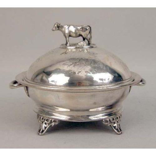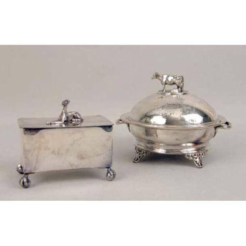 TWO VICTORIAN SILVER-PLATED HOLLOWWARE PIECES<BR><BR>Comprising, a covered butter dish with cow-form finial, and a hinged box with recumbent greyhound on claw-and-ball feet, largest, 5"h x 6"dia.