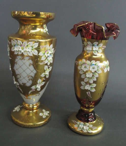 -pink and gold glass vase with hand painted flowers and ruffled rim.