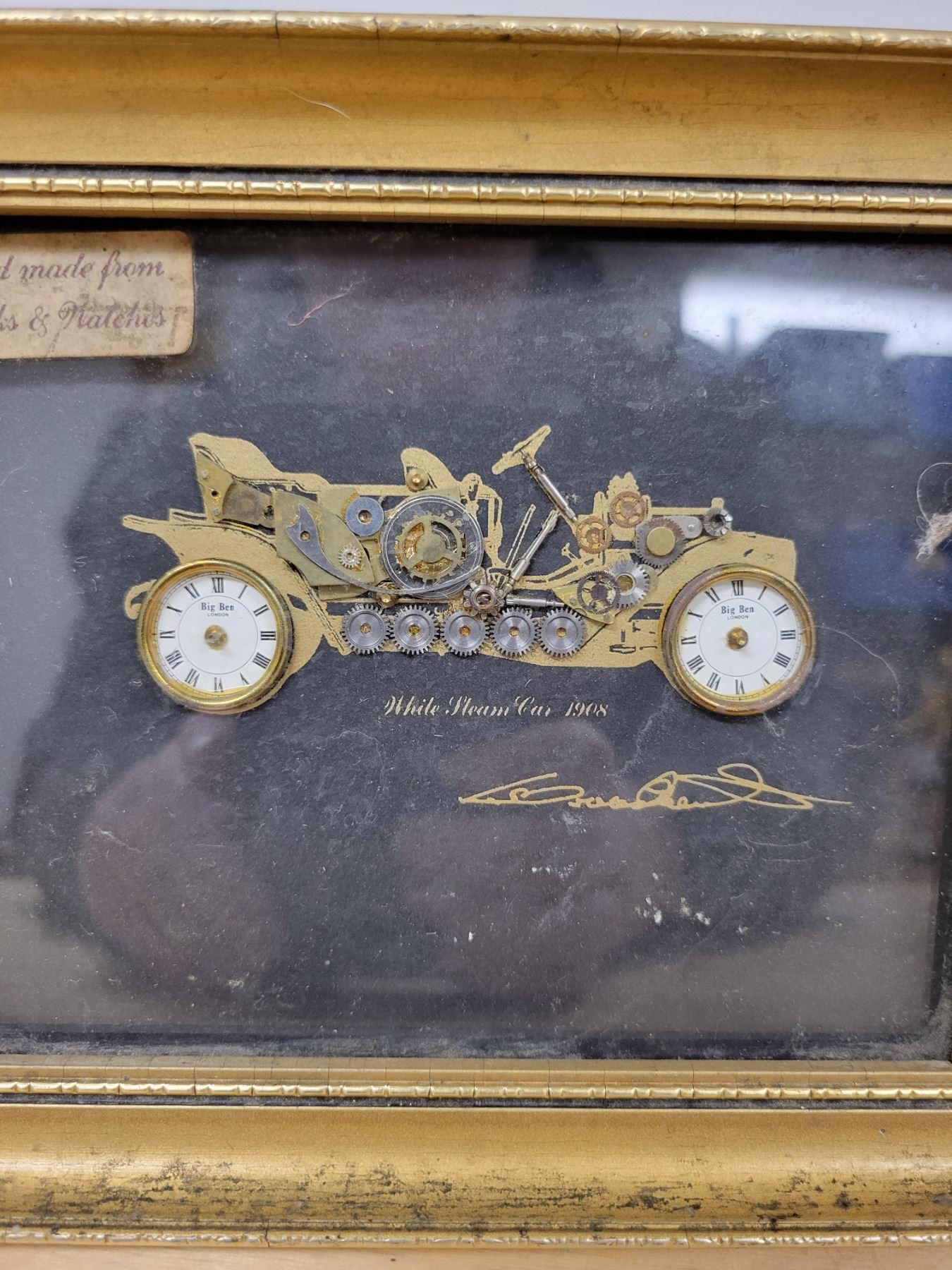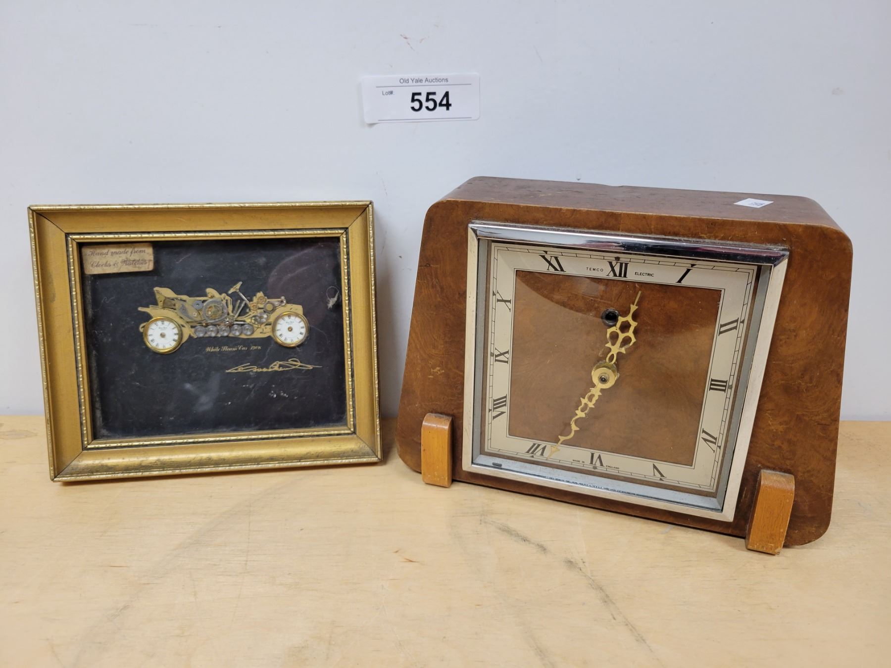 TEMPCO MANTLE CLOCK MADE IN ENGLAND & VINTAGE CAR PICTURE-CAR MADE FROM CLOCKS & WATCH PARTS
