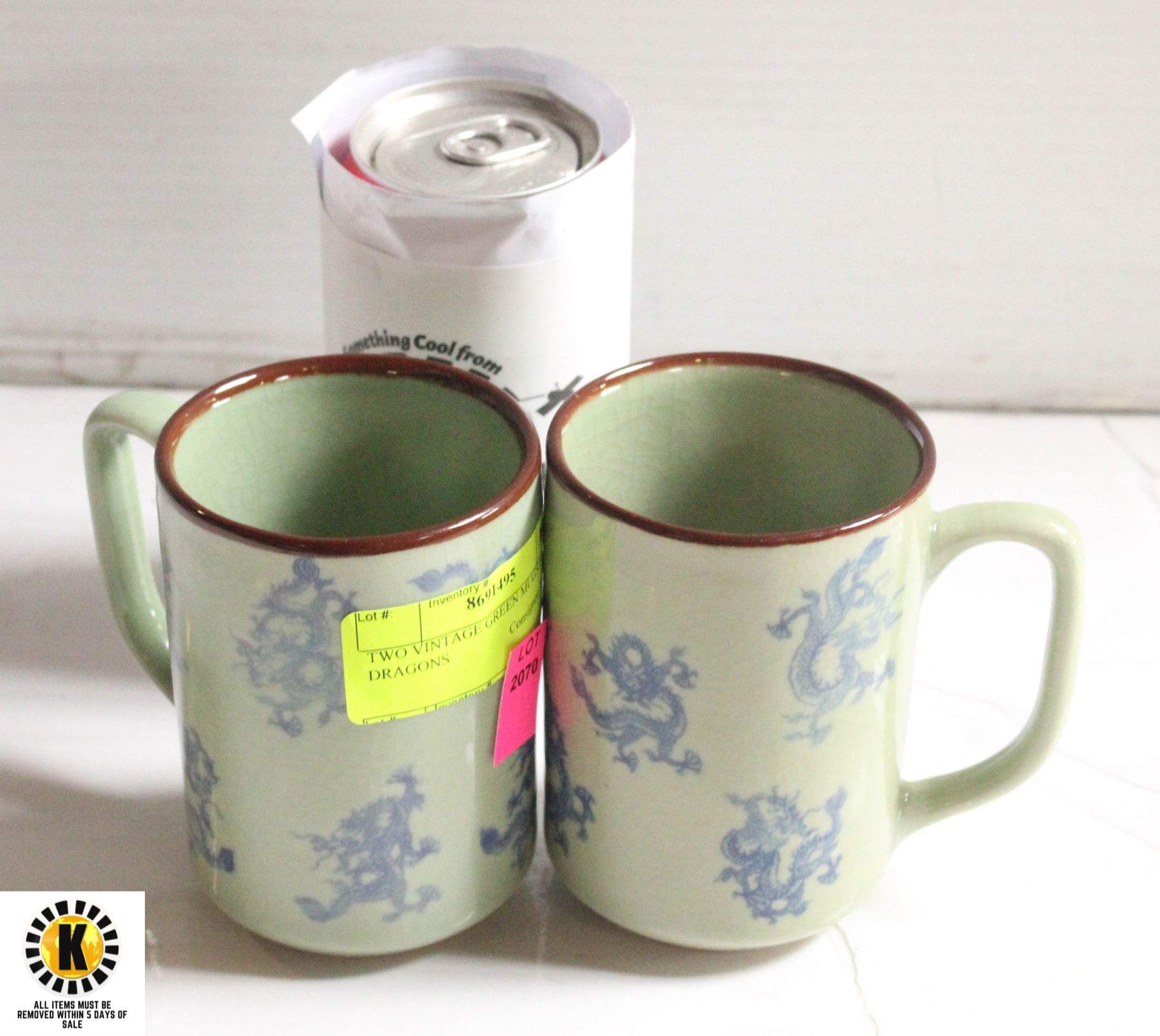 TWO VINTAGE GREEN MUGS BLUE DRAGONS