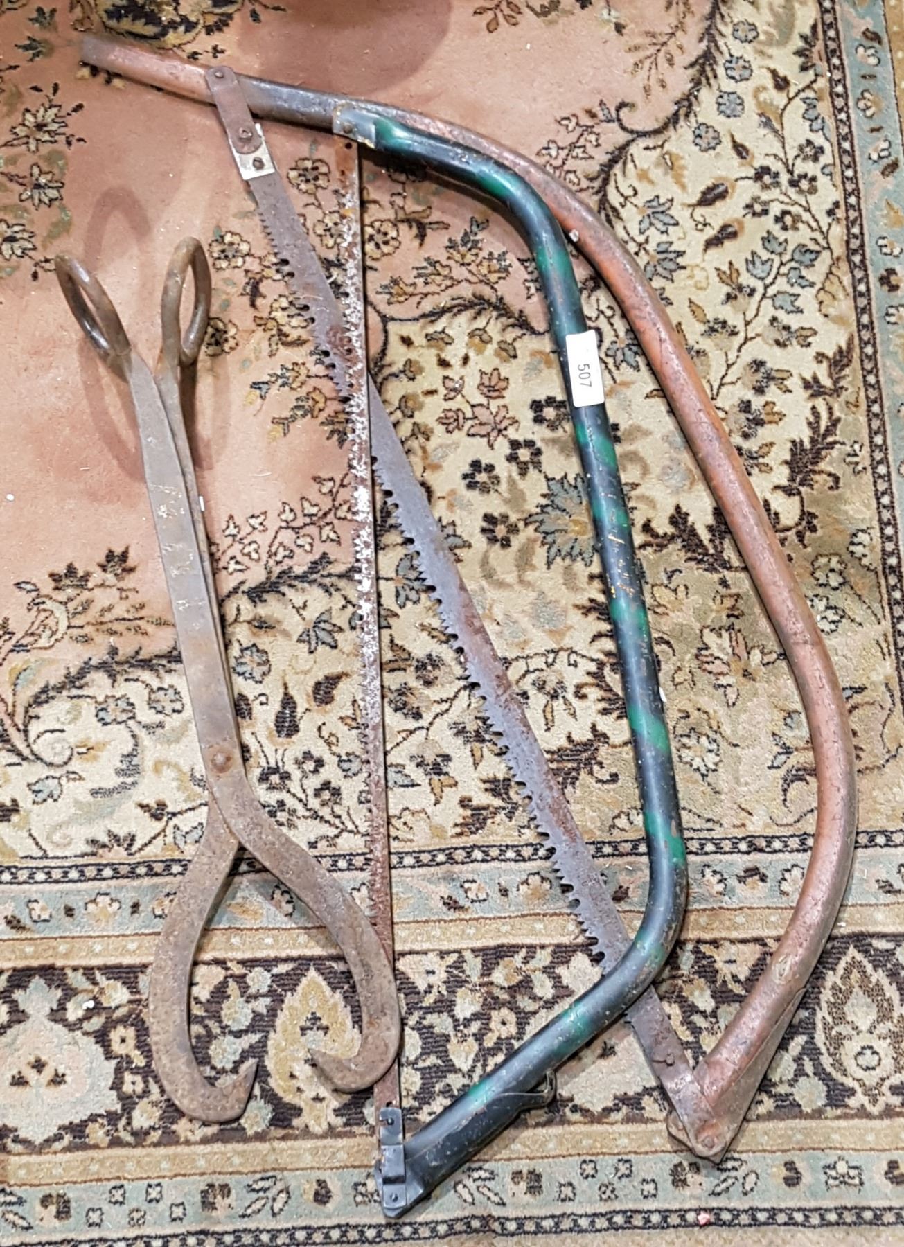 TWO VINTAGE HAND SAWS & PAIR OF ICE TONGS