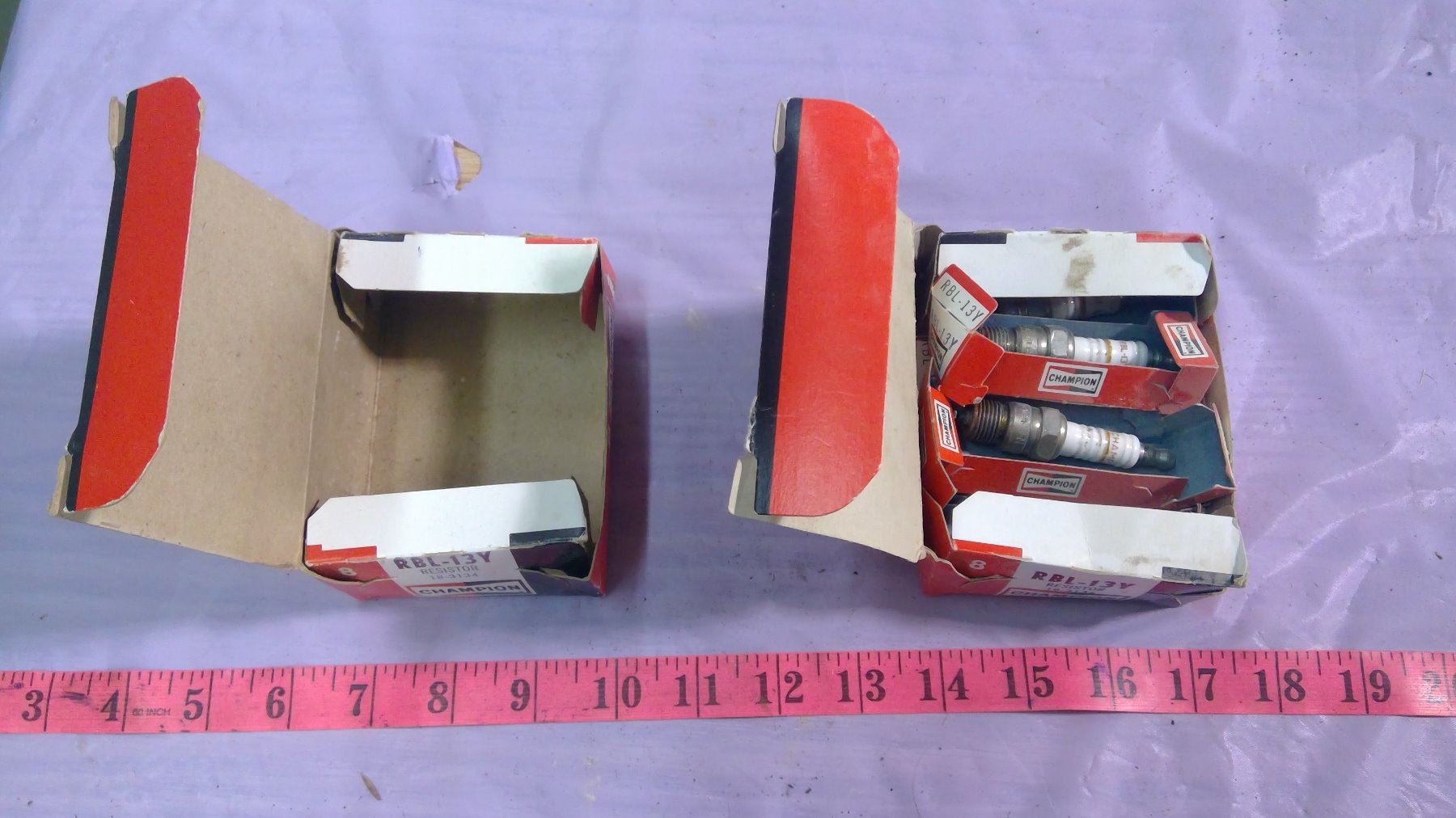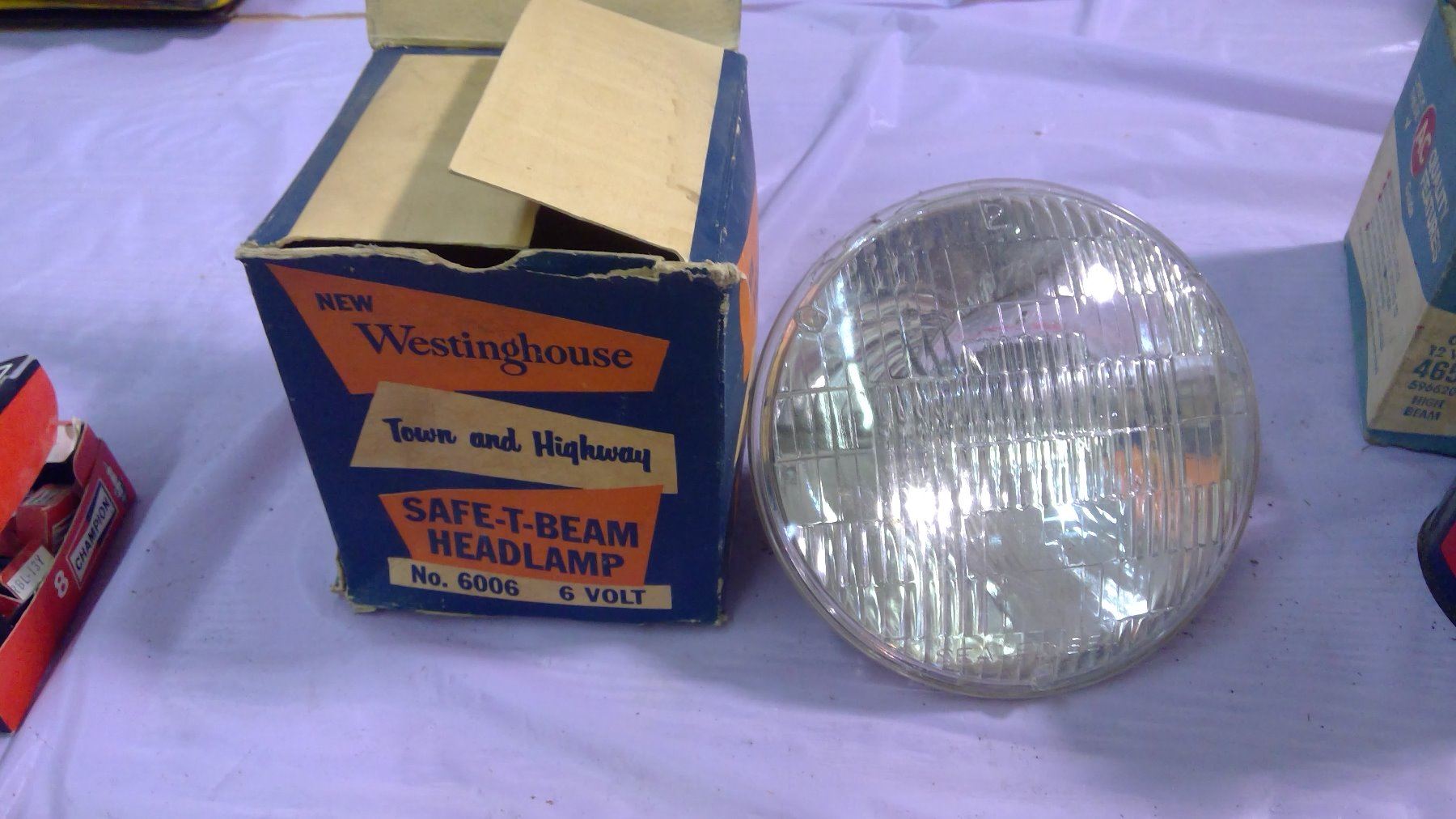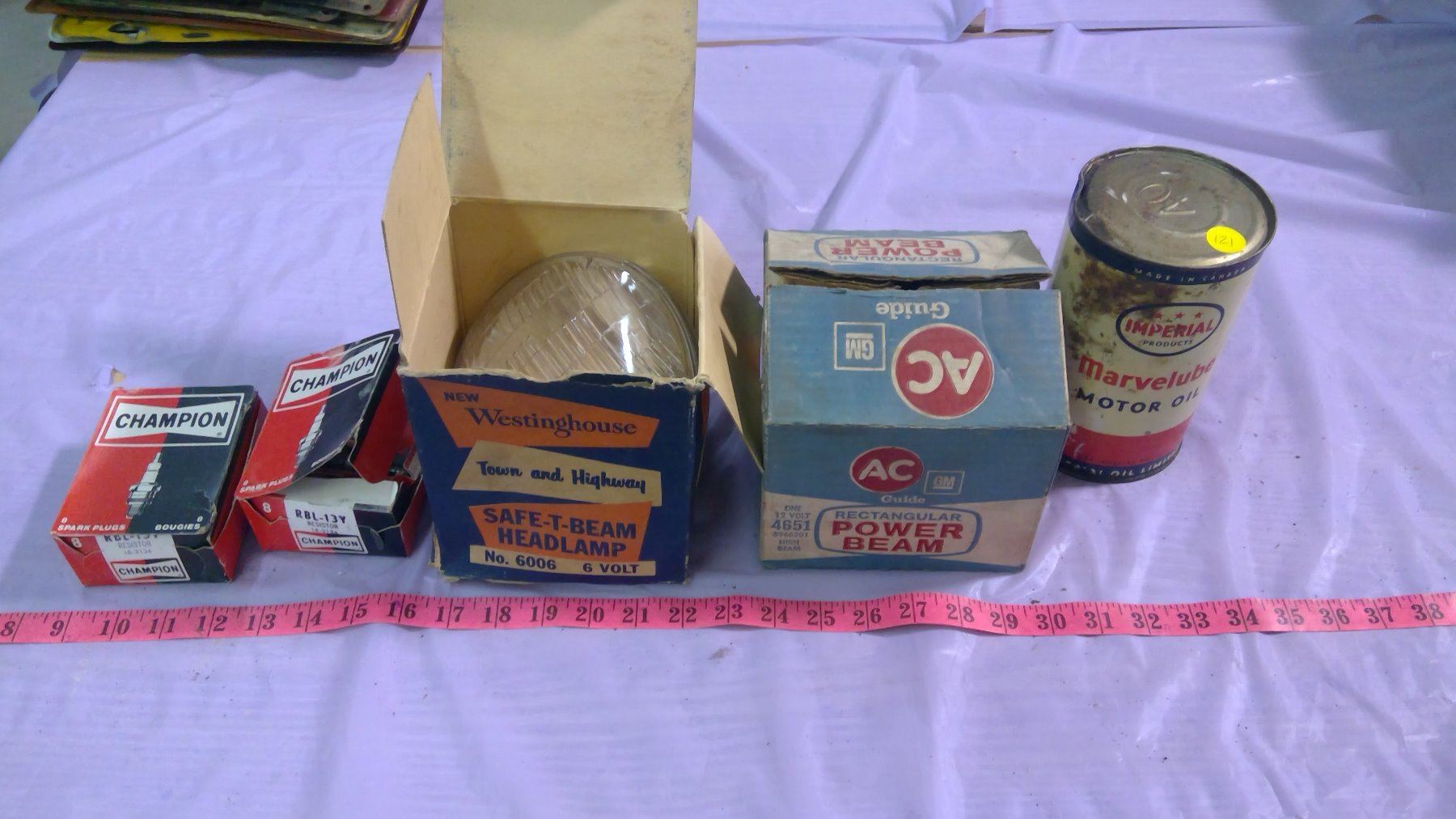 TWO VINTAGE HEADLIGHTS, SPARK PLUGS, SPARK PLUG BOX, ETC.