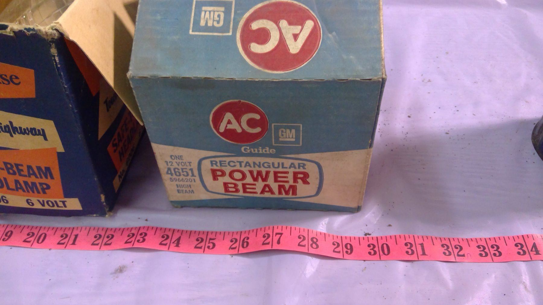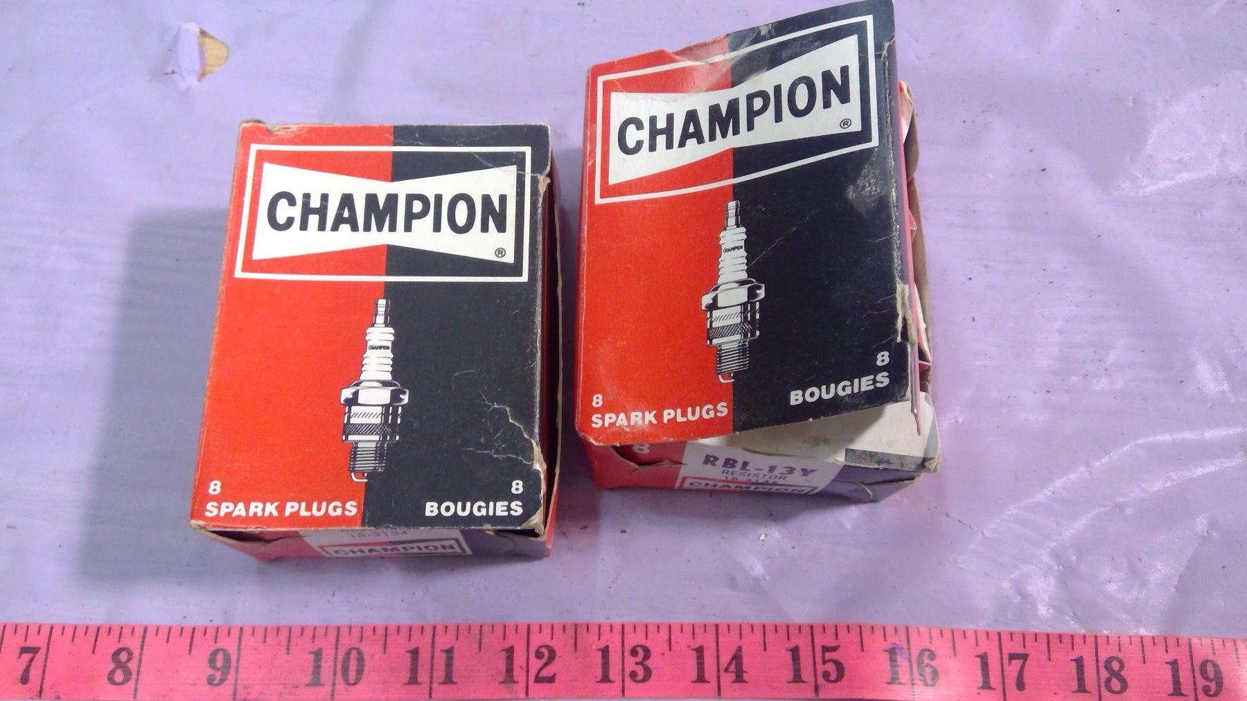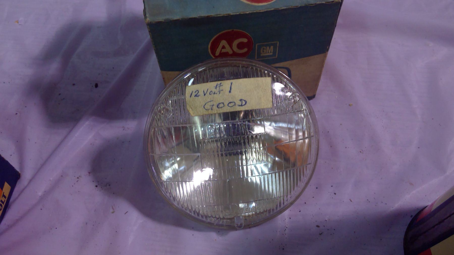 TWO VINTAGE HEADLIGHTS, SPARK PLUGS, SPARK PLUG BOX, ETC.