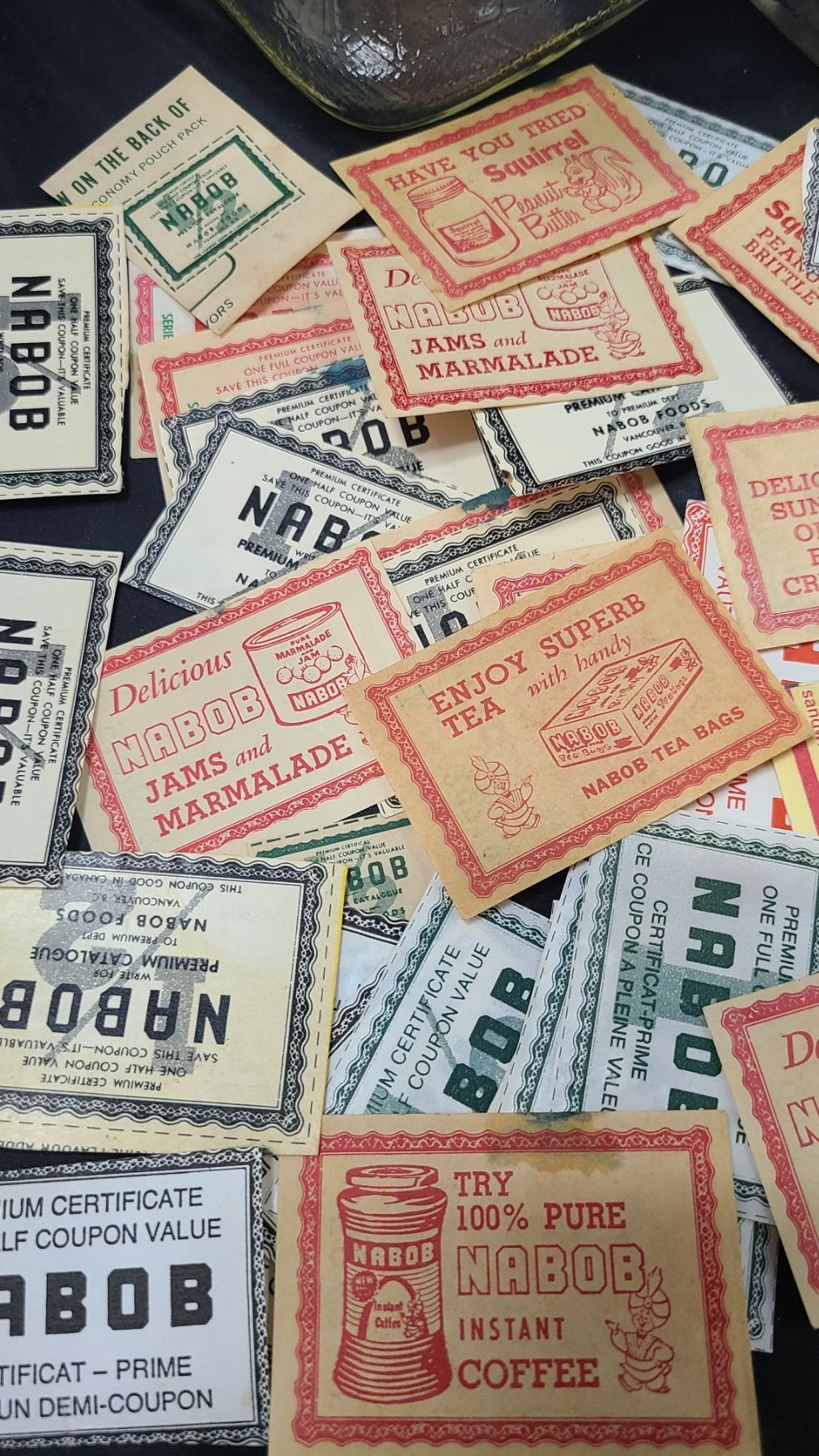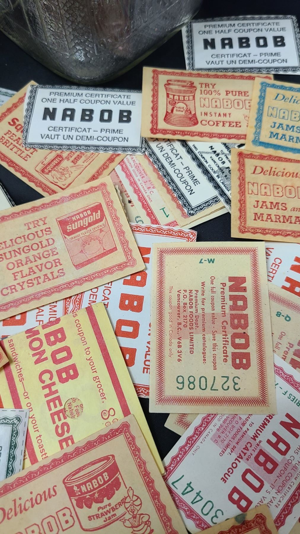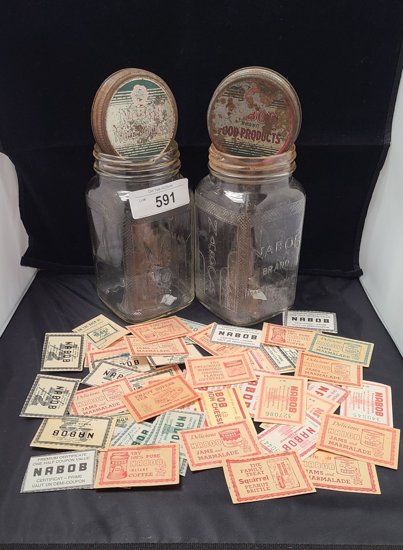 TWO VINTAGE NABOB COFFEE JARS W/COLLECTION NABOB COUPONS