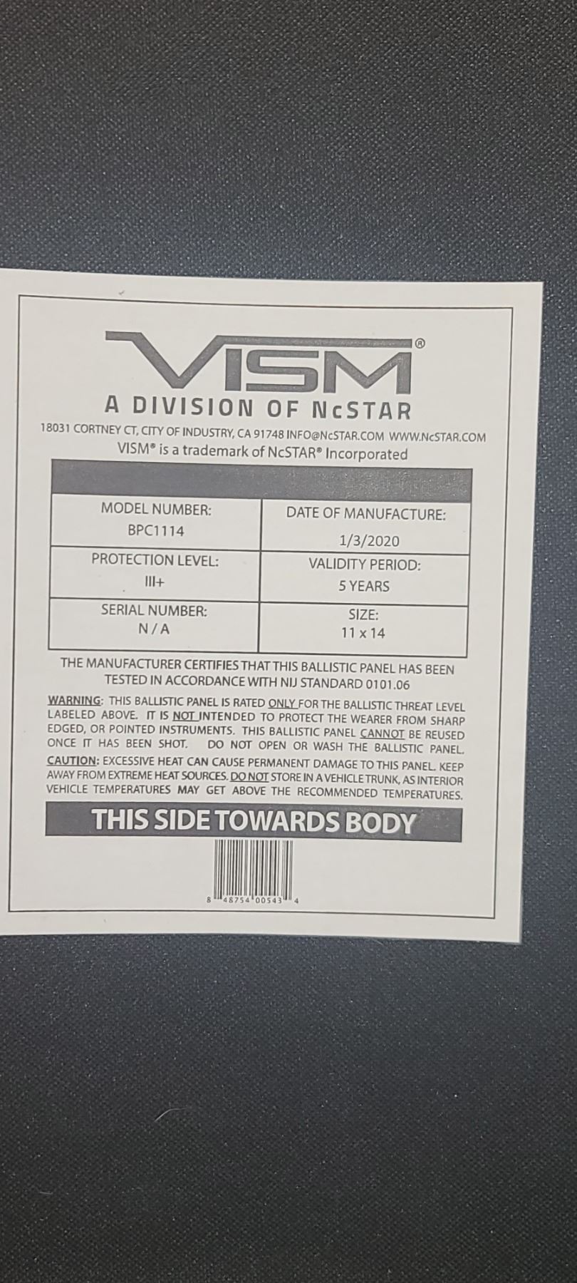 TWO VISM (NCsTAR) PROTECTION LEVEL III PLUS MANUFACTURED1/3/2020 SIZE 11X14 COMES WITH VEST