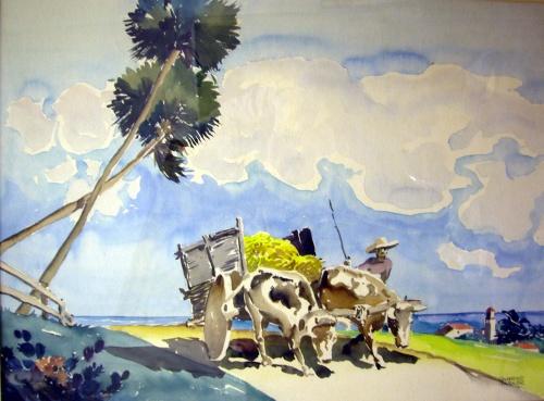 TWO WATERCOLORS ON PAPER; each depicting tropical scenes. The first a peasant and oxcart beneath breaker palms; the second a beach hut beneath breaker and banana palms, each signed l.r. Crawford Parker. 2 pieces. Each 18" x 23 1/2"