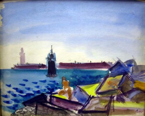 TWO WATERCOLORS ON PAPER; both shore scenes, the first depicting a lighthouse on the water, the second a young boy playing on the beach, both signed l.r. A. Bow (?), both with labels verso from the Raydon Gallery, 1091 Madison Avenue, New York. 2 pieces.
