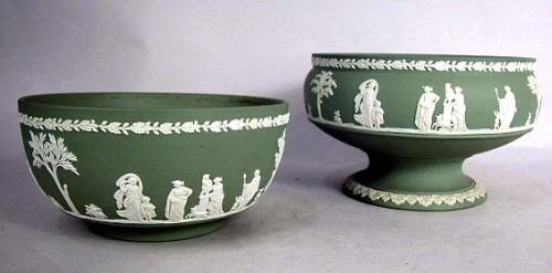 TWO WEDGWOOD, ENGLAND GREEN JASPERWARE CENTERPIECE BOWLS; Both with Neoclassical scenes in white relief, one footed, 5 1/4"h x 8"dia, losses