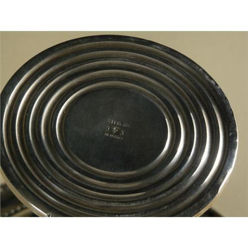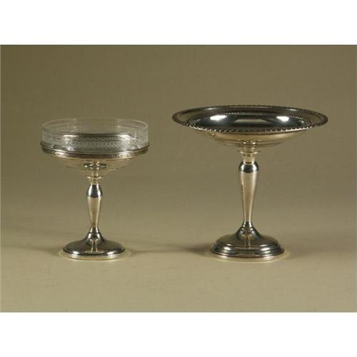 STERLING: Two weighted sterling silver holloware compotes to include one unhallmarked, 6'' x 6.75'', and a second compote with the hallmark for the M. Fred Hirsch Co., Inc. (American 1920-1945) with an etched glass insert, 5.75'' x 4.5'', slight denting noted to bottom rims of both.