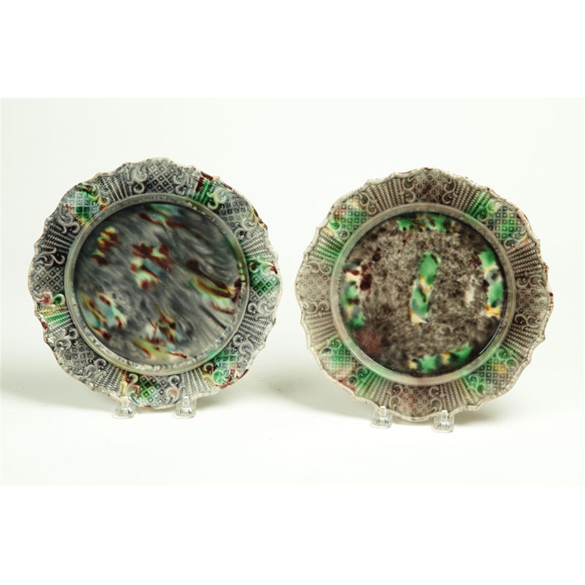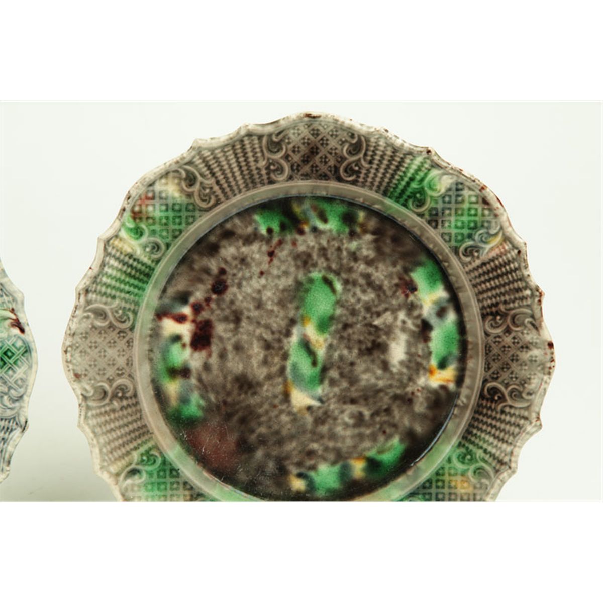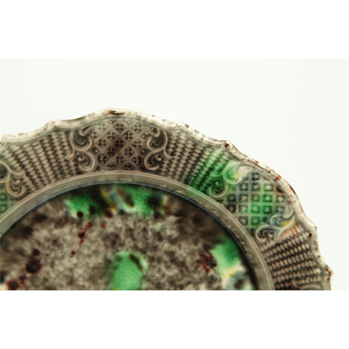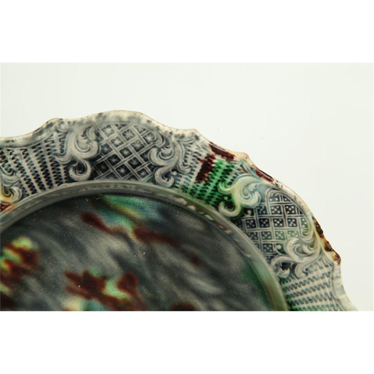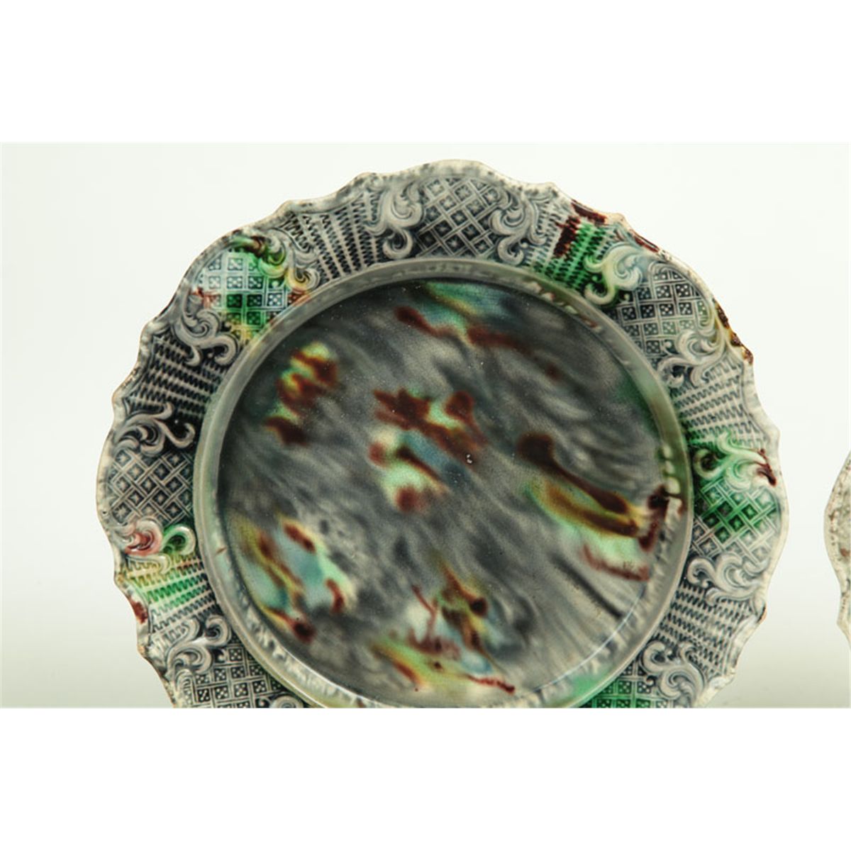 England, 2nd half-18th century, creamware. Similar scalloped rims and tortoise-shell glaze. 9 1/4"d.