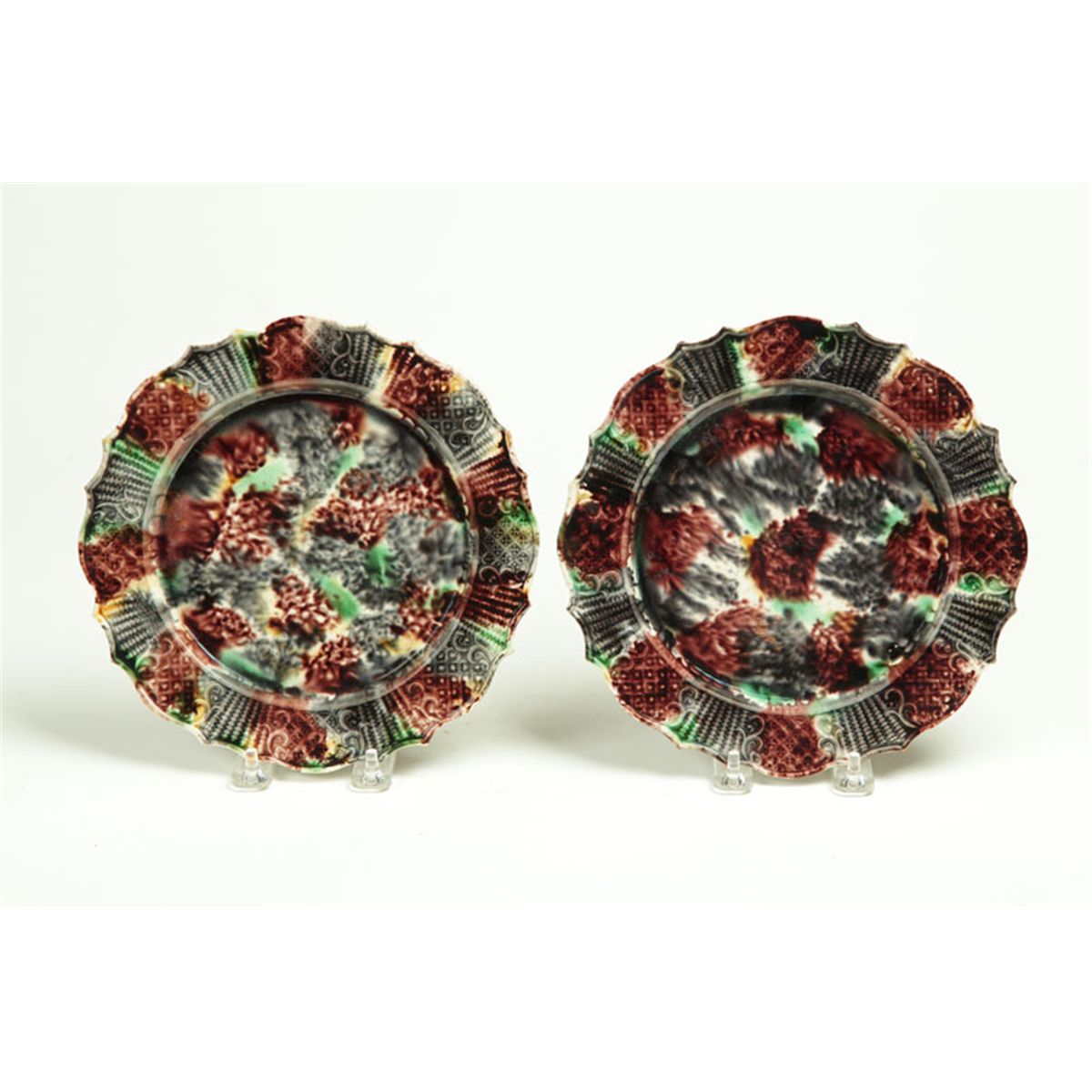 England, 2nd half-18th century, creamware. Matching scalloped, molded rims with tortoise-shell glaze in good colors, 8 3/4"d.