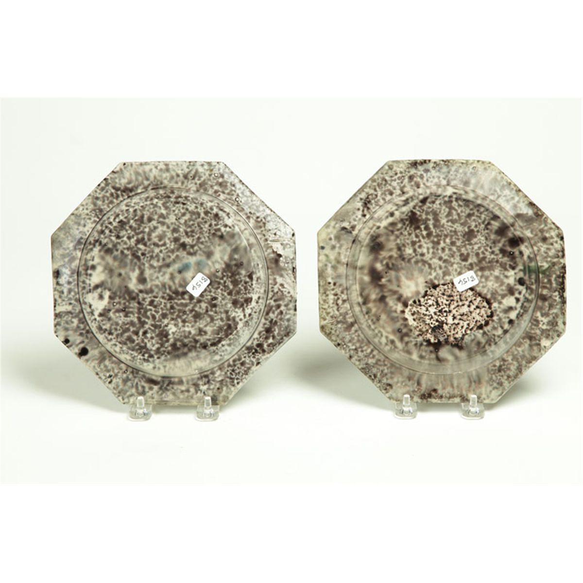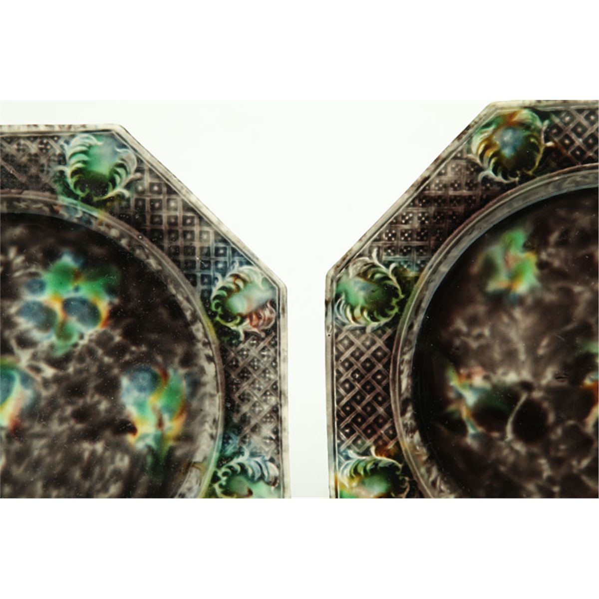 England, 2nd half-18th century, creamware. Matching octagonal, with molded rims and tortoise-shell glaze on a black ground. 8 1/2"d.