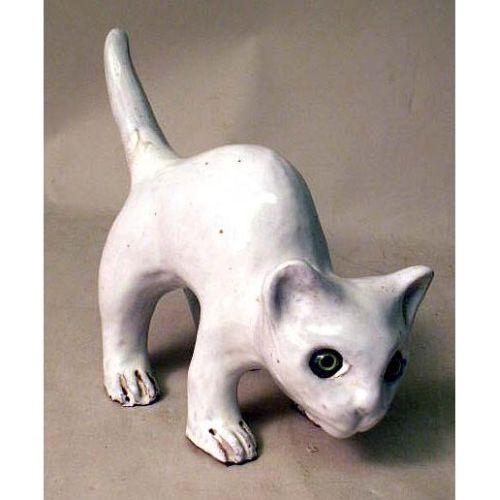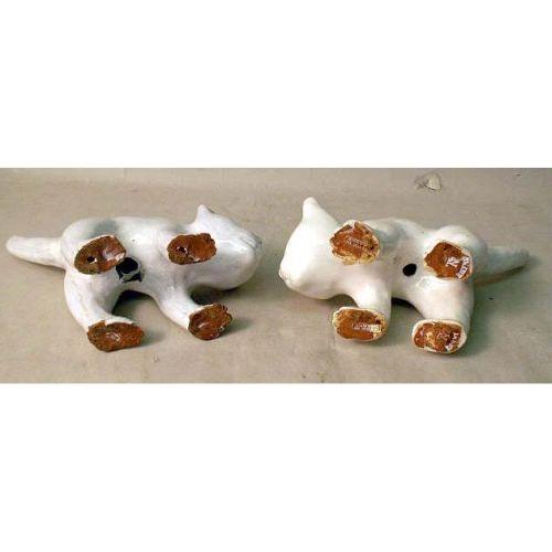TWO WHITE GLAZED FIGURAL REDWARE CATS<BR><BR>Stamped under paw of one "Made in France". 10"l.