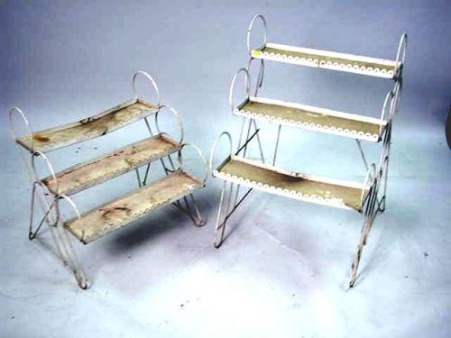 TWO WHITE PAINTED METAL STEPPED PLANTERS; distressed 24"h x 22"w x 16"d