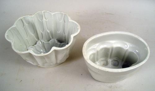 TWO WHITE PUDDING MOLDS, one stoneware, largest,