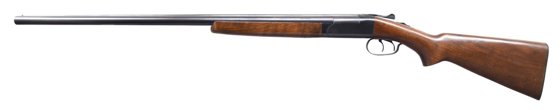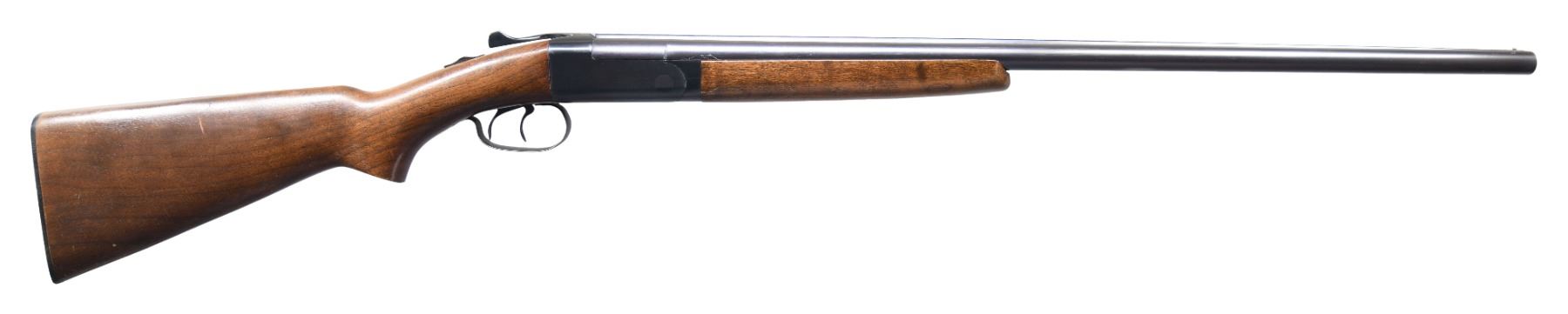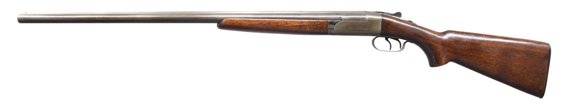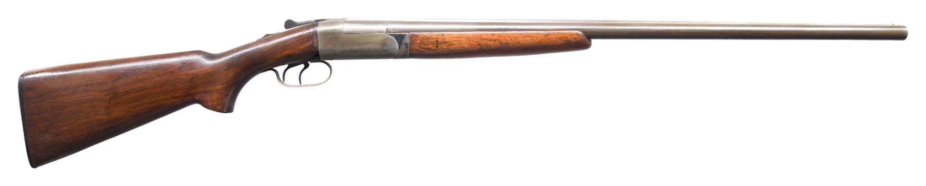 GUN 1: Cal. 12 ga. 2 3/4". S# 4381. Bbls. 28" w/ fixed Mod & Full chokes. Steel front bead. Wide round body action w/ double triggers & non-selective ejectors. Blue finish. Wide walnut forearm & pistol grip stock w/ original hard rubber buttplate. Mfg. 1939. CONDITION: metal has gray coloration from cold blue. Stocks have rough coat of added varnish over wear w/ dents, scratches & marks. Stock has a small chip & crack behind top tang w/ a large chip right of trigger guard. Ejectors are out of time. Right bore is generally bright. Left bore has an area of light pitting forward of chamber. (25-1477/DS). GUN 2: Cal. 16 ga. 2 3/4". S# 98344. Bbls. 28" w/ fixed Mod & Full chokes. Steel front bead. Wide rounded boxlock action w/ double triggers & non-selective ejectors. Wide forearm & pistol grip walnut stock w/ original buttplate. Late 1950s mfg. CONDITION: 95% original blue showing small marks. Original wood finish shows light wear w/ scattered scratches & marks. Sound mechanics. Bright near excellent bores. (25-1478/DS). BOTH CURIOS. $800-1,200.